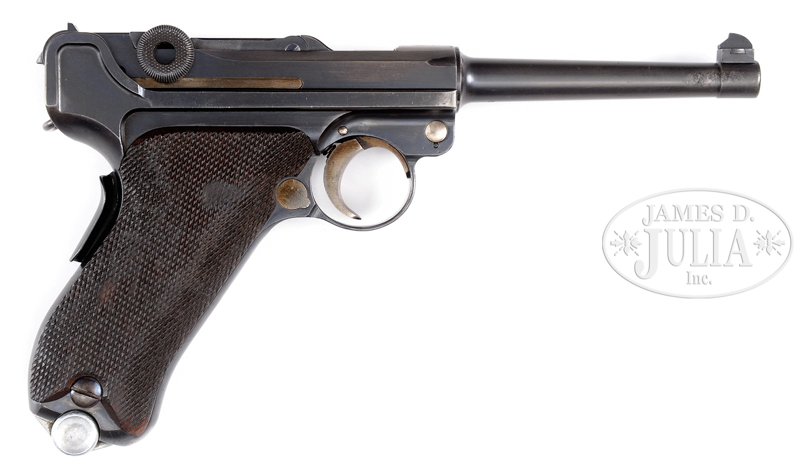 *◊ 1906/34 PORTUGUESE GNR LUGER.SN 1998V. Cal. 7.65 Para. 4-3/4″ bbl with four digit SN and Crown/U proof. “GNR” above chamber. Mauser banner logo on center toggle link. Crown/U proof on left receiver. Numbered parts on gun are matching. Unnumbered checkered walnut grips. Grip safety. Aluminum bottom mag with numbers that do not match. PROVENANCE: The Friedrich-Wilhelm Dauphin Collection, Germany. CONDITION: Fine, retaining 93% blue that is starting to brown with scattered corrosion that is turning to pitting in places. Retains 65% orig straw with scattered corrosion. Grips are worn and oil soaked dark. There is an indent from a holster stud in the right grip and some chips to checkering. Bore is worn with light pitting. Mechanics are fine. Mag has minor dents to body, bottom has little wear. 49829-164 BWS (2,500-3,500) C&R – Lot 1478