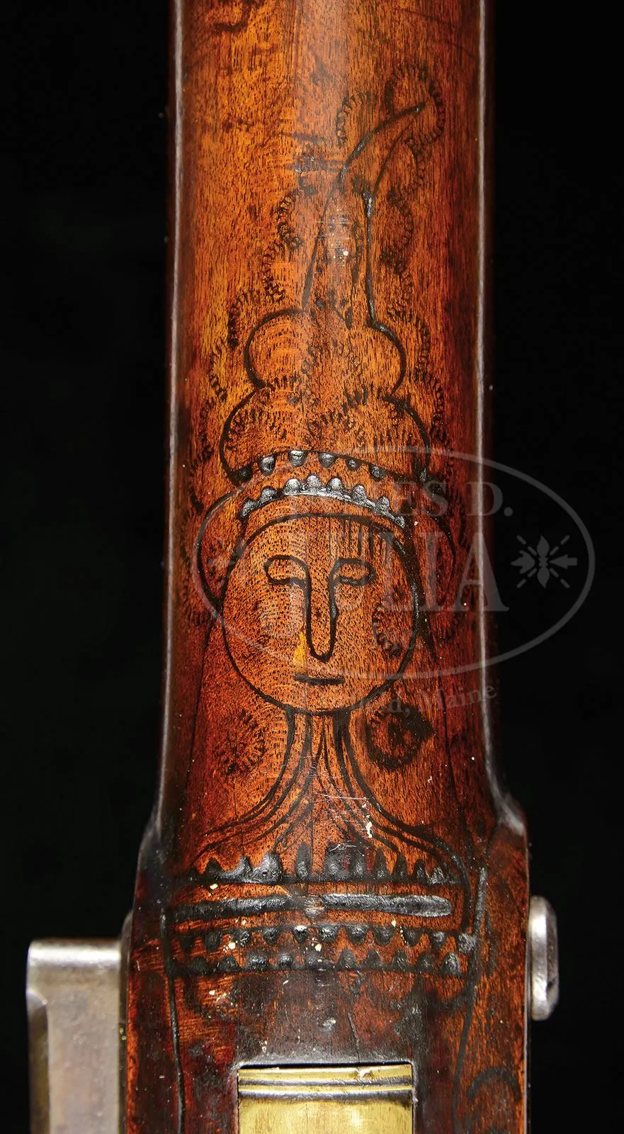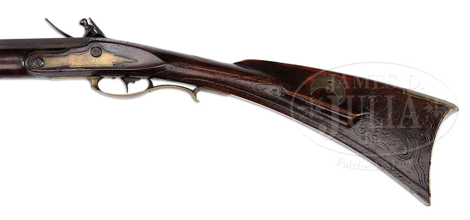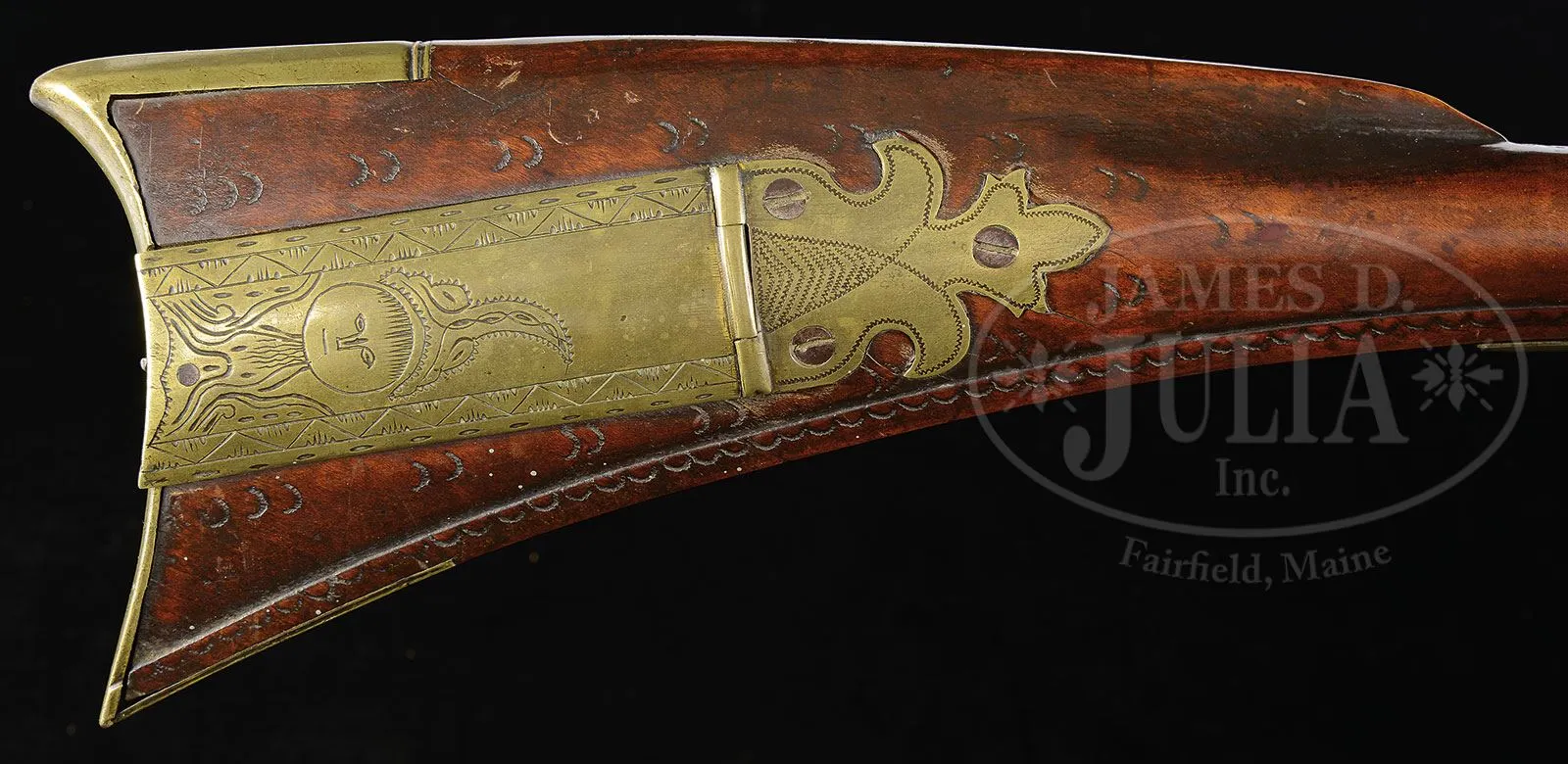 EXTRAORDINARY AND RARE ONE OF A KIND LEHIGH COUNTY LONGRIFLE ATTRIBUTED TO “STOEFFEL LONG” WITH TWO “INDIAN HEADS”.Cal. 50. Gun measures 61″ overall with 45″ fully oct bbl, smooth bore. This is an important Lehigh/Northampton School Golden Age Kentucky Rifle. The stock is profusely incised carved front and rear of the cheekpiece, behind the bbl tang, and around the rear ramrod ferrule in the highly desired Pennsylvania Dutch Kutztown style. The Lehigh County “Indian” is incised carved forward of the trigger guard. Two piece patchbox has a characteristic fleur-de-lis finial with engraved lid again depicting the Lehigh Indian design. The presence of the mysterious “Indian head” design adds greatly to the desirability of any Lehigh County School rifle. To have two heads on one quality rifle is extremely rare. There are many theories regarding the significance of these “Indian heads” including among them the Indian Chief Tammany, the Sons of Liberty, Masonic, religious, etc. The only thing we do know is that the symbol was only important and used in the Lehigh County area. For example: the Sons of Liberty and their Liberty caps brought the Liberty Bell from Philadelphia to Allentown after the Revolution to protect it from the British. There is a decorative carved molding along the bottom of the butt stock. This gun features the areas most desirable stock profile with its pronounced drop at the toe of the stock. The half moon brass engraved cheekpiece inlay and the brass engraved thumb piece inlay are each held with a wood screw as is characteristic on longguns from this school of gunsmithing. The brass two-screw side plate terminates in a point, typical of Long’s rifles. Christoffel Long (Stoffel Long) was born in 1793 and died in October of 1858. He lived and worked in the Town of Stoney Run, Albany Township, Berks County, PA where he is buried in Stoney Run. He was an early gunsmith in the Allemaengel School of Gunsmithing. This gun was made in the Golden Age of Kentucky Rife gunsmithing and a similar gun dated 1819 is pictured in The Kentucky Rifle – A True American Heritage in Picture published in 1967 by the Kentucky Rifle Association. PROVENANCE: Phillip Flayderman, Norm Flayderman Collection, Steve Hench Collection, Dr. William Dupree. CONDITION: Very good to fine overall. The orig hand-forged German style lock is expertly reconverted from percussion to flint. Surfaces to brass mostly smooth with mustard colored patina. Wood and metal have an old, thin varnish over most of the surface. Wood overall is sound with typical small blemishes. Black light inspection reveals a minor expertly repaired crack at base of lock and one small inset repaired wood sliver 1″ x 1/4″ above metal pipe on right side of stock. 4-54771 RG (30,000-50,000) – Lot 1478a Click here to view provenance
