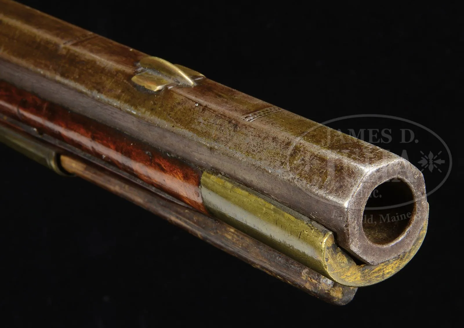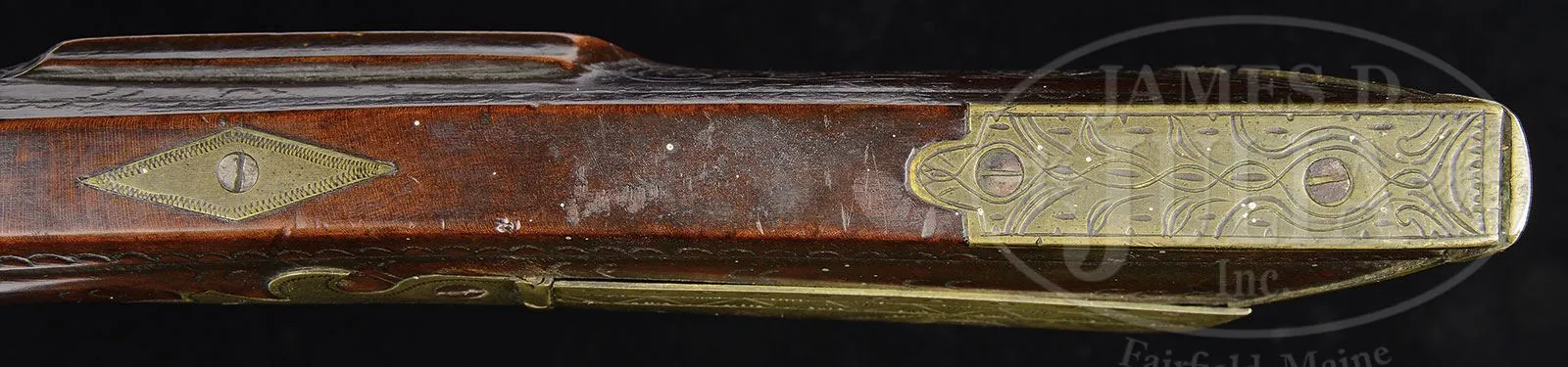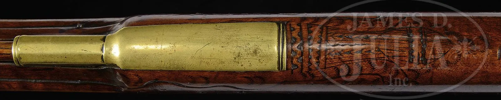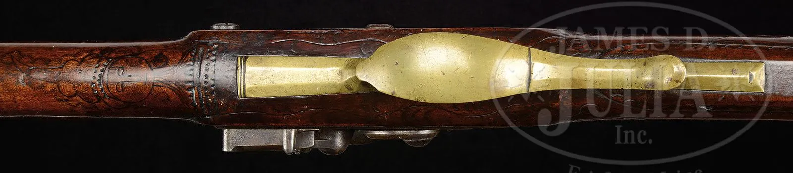 EXTRAORDINARY AND RARE ONE OF A KIND LEHIGH COUNTY LONGRIFLE ATTRIBUTED TO “STOEFFEL LONG” WITH TWO “INDIAN HEADS”.Cal. 50. Gun measures 61″ overall with 45″ fully oct bbl, smooth bore. This is an important Lehigh/Northampton School Golden Age Kentucky Rifle. The stock is profusely incised carved front and rear of the cheekpiece, behind the bbl tang, and around the rear ramrod ferrule in the highly desired Pennsylvania Dutch Kutztown style. The Lehigh County “Indian” is incised carved forward of the trigger guard. Two piece patchbox has a characteristic fleur-de-lis finial with engraved lid again depicting the Lehigh Indian design. The presence of the mysterious “Indian head” design adds greatly to the desirability of any Lehigh County School rifle. To have two heads on one quality rifle is extremely rare. There are many theories regarding the significance of these “Indian heads” including among them the Indian Chief Tammany, the Sons of Liberty, Masonic, religious, etc. The only thing we do know is that the symbol was only important and used in the Lehigh County area. For example: the Sons of Liberty and their Liberty caps brought the Liberty Bell from Philadelphia to Allentown after the Revolution to protect it from the British. There is a decorative carved molding along the bottom of the butt stock. This gun features the areas most desirable stock profile with its pronounced drop at the toe of the stock. The half moon brass engraved cheekpiece inlay and the brass engraved thumb piece inlay are each held with a wood screw as is characteristic on longguns from this school of gunsmithing. The brass two-screw side plate terminates in a point, typical of Long’s rifles. Christoffel Long (Stoffel Long) was born in 1793 and died in October of 1858. He lived and worked in the Town of Stoney Run, Albany Township, Berks County, PA where he is buried in Stoney Run. He was an early gunsmith in the Allemaengel School of Gunsmithing. This gun was made in the Golden Age of Kentucky Rife gunsmithing and a similar gun dated 1819 is pictured in The Kentucky Rifle – A True American Heritage in Picture published in 1967 by the Kentucky Rifle Association. PROVENANCE: Phillip Flayderman, Norm Flayderman Collection, Steve Hench Collection, Dr. William Dupree. CONDITION: Very good to fine overall. The orig hand-forged German style lock is expertly reconverted from percussion to flint. Surfaces to brass mostly smooth with mustard colored patina. Wood and metal have an old, thin varnish over most of the surface. Wood overall is sound with typical small blemishes. Black light inspection reveals a minor expertly repaired crack at base of lock and one small inset repaired wood sliver 1″ x 1/4″ above metal pipe on right side of stock. 4-54771 RG (30,000-50,000) – Lot 1478a Click here to view provenance