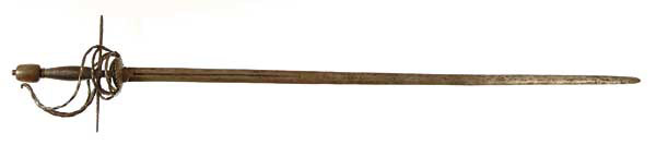 GERMANIC BASKET HILT SWORD. 42-1/2″ single fuller blade with decorations simulating markings. There is also minor brass inlay at the hilt. CONDITION: Blade has been repaired about midway with a lap weld. Crosshatching on both sides of the blade blend in the repair. Front of the blade is deeply pitted and slightly smaller in width. Guard is hand forged, the wire wrapping on the hilt is probably replaced as is the simply decorated pommel. 4-46954 (1,500-2,200)