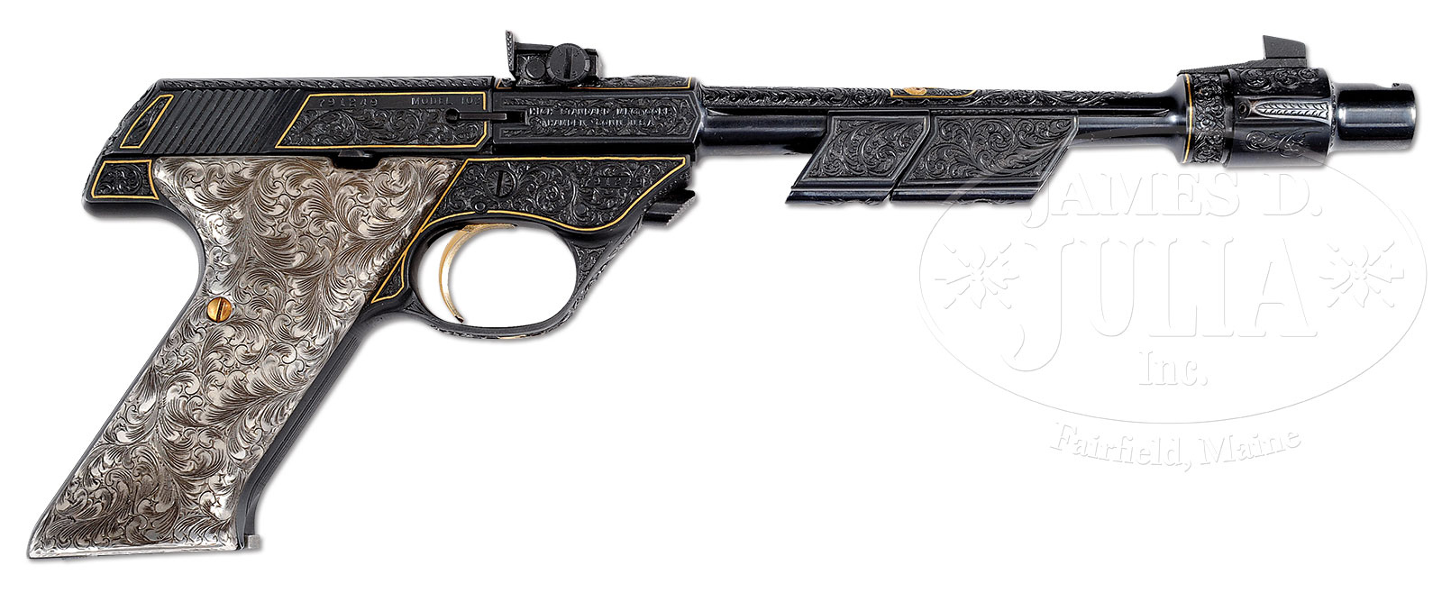 *SCARCE PRUDHOMME ENGRAVED WITH GOLD HIGH STANDARD SUPERMATIC TROPHY MODEL 102 SEMI-AUTO PISTOL.SN 791249. Cal 22 LR. Blue finish with 9″ “Buck Rogers” tapered bbl with muzzle brake which has a Partridge front sight. The fully adjustable rear sight is at the rear end of the bbl over the chamber area. The bbl also has 2 orig weights. Pistol is full coverage engraved in relief patterns of flowing foliate & arabesque scrolls that has a fine stippled background. Sides of the slide & frame are outlined in gold wire. Top of the bbl over the chamber area is relief engraved with a standing woodchuck. Center part of the bbl is relief engraved with a raised gold squirrel on a limb surrounded by gold wire inlay. Rear edge of the muzzle break boss is also inlaid in fine gold wire. Rear of the slide & frame are engraved to match with a small Confederate style flag engraved with the engraver’s name on one of the bars. Trigger bow is engraved in relief floral patterns and inlaid in gold with the initials “WJD”. WJD is William J. Donovan – Vice President of Sales for High Standard. This was his personal gun! Pistol is mounted with incredible, one of a kind grips that have fully engraved silver sheathing over wood base. Bottom edge of left grip is engraved “S.P HERRETT”. Herrett grips are world renowned and widely known for their quality and style. Bottom of the magazine is maker marked and lightly engraved. Bottom of the bbl, just in front of the frame is stamped with tiny initial “P”. Edward C. Prudhomme “1911-1990” was a master engraver and produced numerous high quality engraved firearms over his career. Very few were more well executed than the high standard pistol offered here. The extraordinary engraving & gold work along with the incredible, one of a kind set of silver grips make this pistol one of his finest pieces of work. Accompanied by a custom red felt lined oak casing that has the high standard oval logo inside the lid. Also in the case is an orig set of high standard full checkered, thumb rest wood grips with 2 engraved grip screws. Included with this gun is information from the engraver, E.C. Prudhomme, along with a Prudhomme catalog wherein this exact gun is featured. As well, there are letters from High Standard Head of Sales, Bill Donovan concerning this gun and confirming it as being used in the 1964-1965 Worlds Fair display in the Connecticut Pavillion representing the Firearms Industry of Connecticut that High Standard was part of. One of only 6 known engraved High Standard Pistols according to our consignor that can be proven to be factory engraved as ordered by The V.P. of Sales, William Donovan. PROVENANCE: The Frank H. Wheaton, III Collection. CONDITION: Extremely fine. Overall retains about 99% crisp custom finish applied at the time of engraving. Pistol remains unfired since engraving. Mechanics are crisp, brilliant shiny bore. Case is very fine with some minor chips in the finish and a grain check in the lid. Interior is moderately soiled & faded. 51516-19 (12,500-15,000) C&R – Lot 1480 | Click here to view provenance