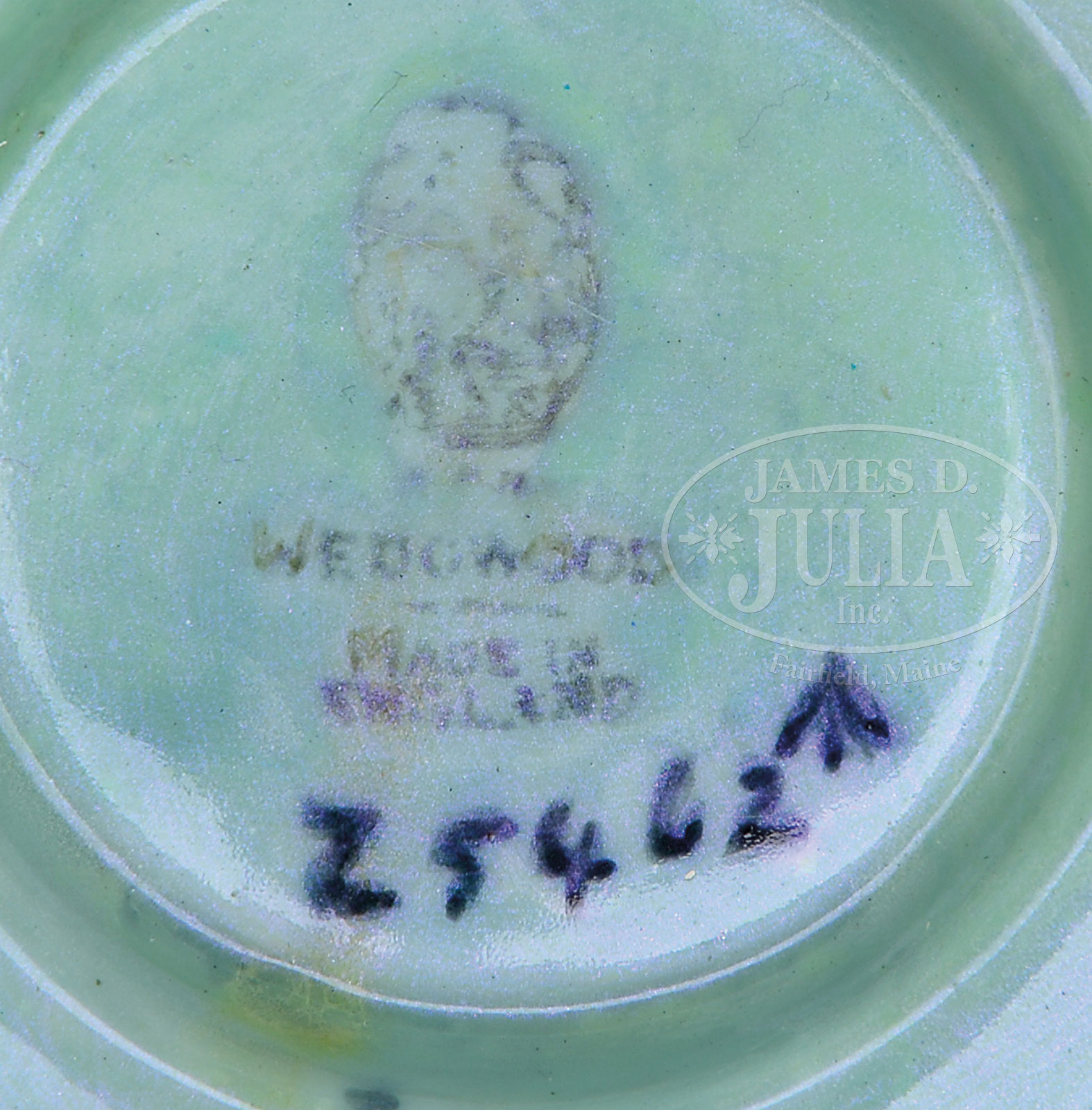 WEDGWOOD FAIRYLAND MELBA BOWL.Wedgwood Fairyland Lustre Melba bowl is decorated on the exterior with Woodland Elves IV-Big Eyes pattern, having whimsical fairies and elves playing in a forest of purple and green foliage with gilded accents against a rich blue lustre background. Interior of bowl is decorated in Jumping Faun ‘Moonlight Fairyland’ pattern with river scene of oriental style boats and buildings on rich blue lustre with pale yellow sky and gilded highlights. Signed on the bottom with Wedgwood Portland vase logo and “Z5462”. SIZE: 5-1/2″ t x 9″ w. CONDITION: Very good with light wear to the gilded spiderwebs on exterior, gilded medallion in bottom of interior. 52020-2 (5,000-7,000) – Lot 1481