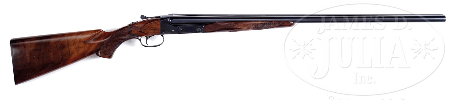 *BEAUTIFUL HIGH CONDITION WINCHESTER MODEL 21 FIELD GUN WITH HANG TAG.SN 28806. Cal. 16 Ga. 28″ bbls. 2-3/4″ chambers, as marked. Choked: CYL/FULL. Full length matted rib with steel front bead. Single selective trigger, automatic ejectors, automatic safety. Full pistol grip stock with 14″ LOP over Winchester black plastic buttplate. Stock shows beautiful contrasting grain. Beavertail forend with standard Field Grade checkering pattern. Left bbl marked “MODEL 21 / WINCHESTER / 16 GAUGE”. Weight: 6 lb 12 oz. PROVENANCE: Original hang tag. CONDITION: Extremely fine. Bbls, receiver, trigger guard, trigger, and forend metal retain nearly all their orig blue with minute handling marks. Buttstock and forend retain virtually all their orig factory hand rubbed oil finish with a few light handling marks and scratches. Mechanics are excellent, ejectors slightly out of time. Bores are bright and shiny. An exceptional orig Model 21. 49473-1 JSL86 (4,000-7,000) – Lot 1482 Click here to view provenance