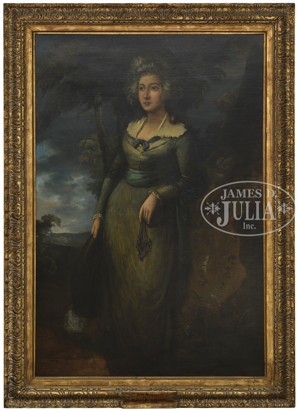 AFTER THOMAS GAINSBOROUGH (English, 1727-1788) PORTRAIT OF LADY MULGRAVE.A 19th Century oil on canvas copy of a similar portrait by Thomas Gainsborough. A full length portrait of Lady Mulgrave wearing a blue dress and a black lace wrap in an idyllic landscape. Unsigned. Housed in a period carved gilt wood frame. SIZE: 55-1/2″ x 37-3/4″. Overall: 64-3/4″ x 46″ CONDITION: Surface grime, shrinkage cracks and restoration. 9-96441 (1,800-2,200) – Lot 1485