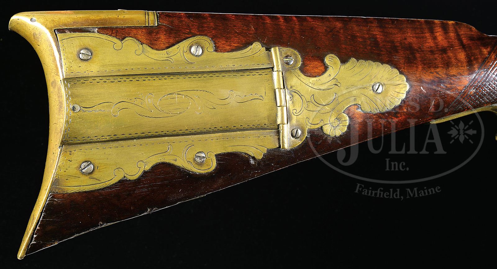 INCISE CARVED FLINTLOCK RIFLE ATTRIBUTED TO YORK COUNTY GUNSMITH GEORGE BRENISE.Cal. 50 rifled. 40-3/4″ oct bbl, George Brenise was a gun maker in York County whose work is uncommon. This rifle has remnants of his signature at the very breech end of the bbl. The signature is cut off because the bbl and stock were shortened. The curly maple stock, does have a pleasing, mellow color and is very nicely incised carved along the cheekpiece side and also has wrist-checkering. There is incised carving around the rear ramrod pipe and the forestock has a very fine molding. The engraved patchbox is similar to those seen on his few other remaining signed rifles. PROVENANCE: Collection of Dr. Douglas Sirkin. CONDITION: The flintlock is a replacement lock. The wood surrounding the entire lock is a thick veneer set in to accommodate the new lock. There is a break through the wrist which is held together with screws covered over by putty. A re-glued age crack is on the right side of forearm. 4-49767 SDH24 (10,000-20,000) – Lot 1487 Click here to view provenance