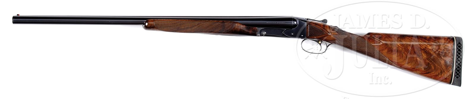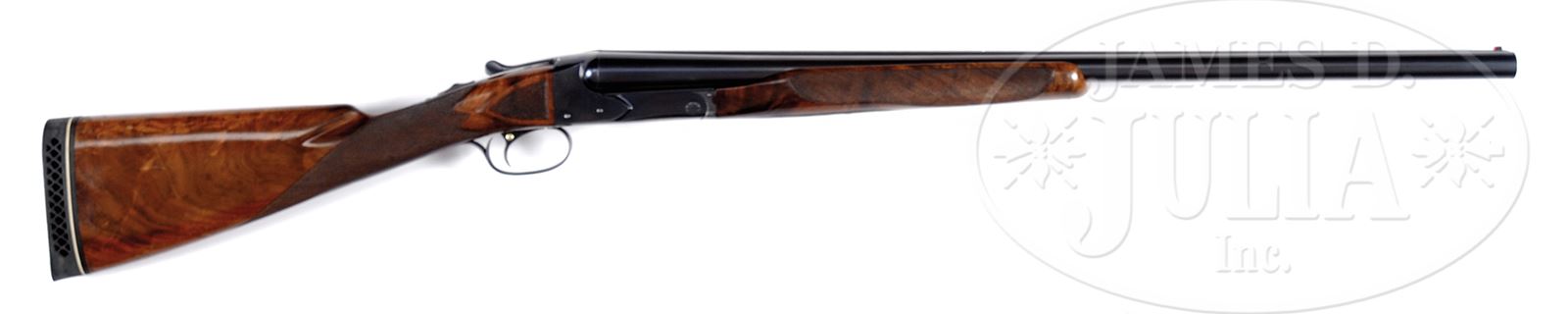 *WINCHESTER MODEL 21, TRAP AND SKEET.SN 3155. 12 Ga. 26″ bbl, 2-3/4″ chambers, CHOKE: WS1/WS2. Full length matted rib with steel mid bead and red plastic front bead. Single selective trigger, automatic ejectors, non-automatic safety. Straight grip stock checkered in three-point pattern with checkered side panels with 13-1/4″ LOP from rear position single trigger over Pachmayr white line waffle pad. Beavertail forearm checkered in standard pattern, with roll- type release. Receiver is un-engraved but stamped on trigger plate Trap/Skeet. WEIGHT: 7 lbs, 5 oz. CONDITION: Excellent. Bbls retain 95-97% orig blue. Receiver retains 95-97% orig blue finish just starting to tone on bottom with high point edge wear. Trigger guard and forearm retain 75-80% blued finish just starting to tone. Forearm is excellent with a few light handling marks and retains most of its orig finish. Buttstock is very good. Checkering is sharp. Finish is slightly crazed with minor chips and losses in finish at toe. Mechanics are excellent. Bright and shiny bores. 49417-52 JSL209 C&R (4,000-6,000) – Lot 1487