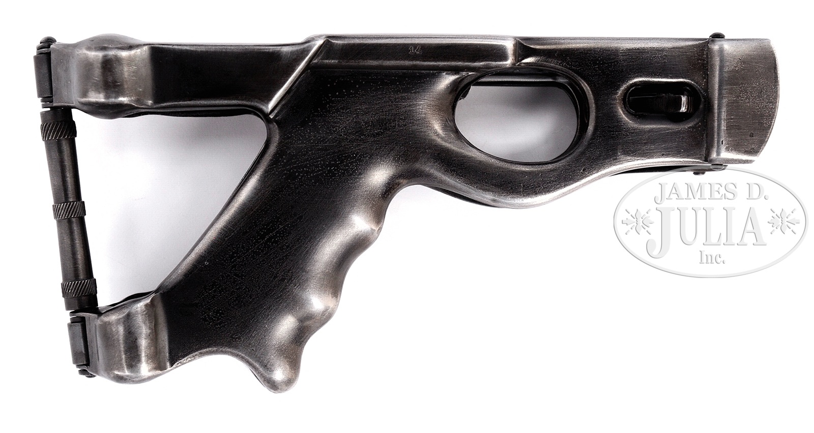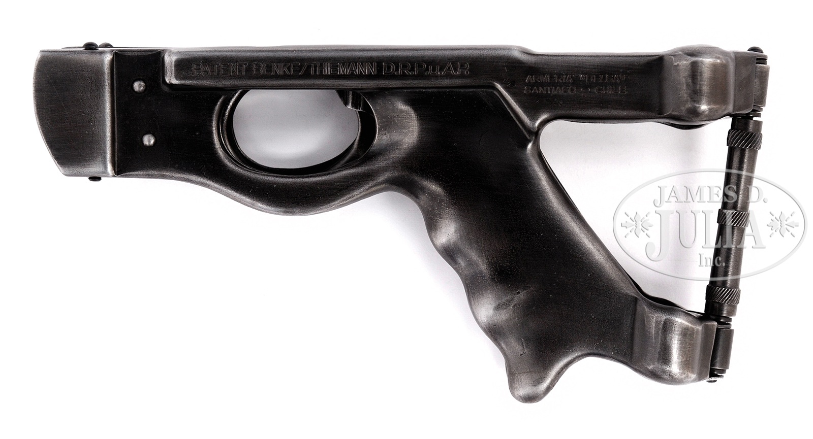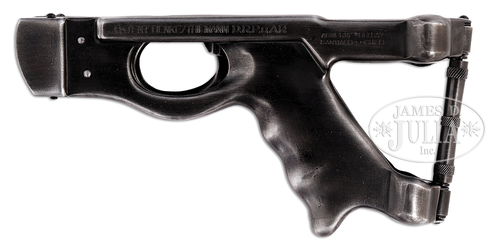 RARE CHILEAN MARKED BENKE THIEMANN LUGER STOCK.SN 14. Stamped sheet metal folding stock that replaces orig grips on Luger. Compact when closed, it opens into a shoulder stock. “PATENT BENKE/THIEMANN D.R.P.u.A.P.” on left side. “ARMERIA “BELGA”/SANTIAGO-CHILE” retailer marked, also on left side. Right side has SN 14. Very few of these stocks were made. The Chilean retailer mark (if original) is extremely rare. PROVENANCE: The Friedrich-Wilhelm Dauphin Collection, Germany. CONDITION: Very fine, retaining 60% orig black finish that is wearing to bare metal on external surfaces. Mechanics are fine. 49829-198 (5,000-10,000) – Lot 1489