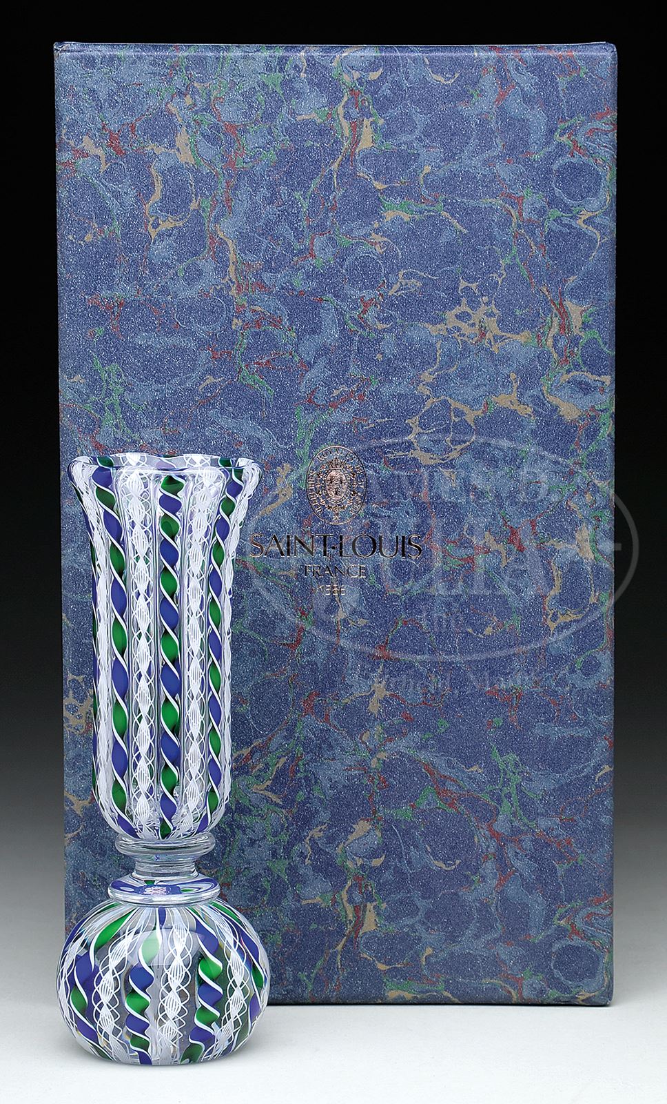 MODERN ST. LOUIS 1992 CROWN PAPERWEIGHT PEN HOLDER.Modern St. Louis, French crown paperweight pen holder with cobalt and green ribbons alternating with white latticino chaplet bead pattern. Paperweight: is attached by a clear wafer, to a matching patterned penholder. The paperweight is dated in cane at top “SL1992”. As well as “Cristal St. Louis France 3 of 15”. Penholder is housed in its original fitted box with certificate of authenticity. SIZE: 6-1/2″ t. CONDITION: New out of box. 50397-80 (600-800) – Lot 1490