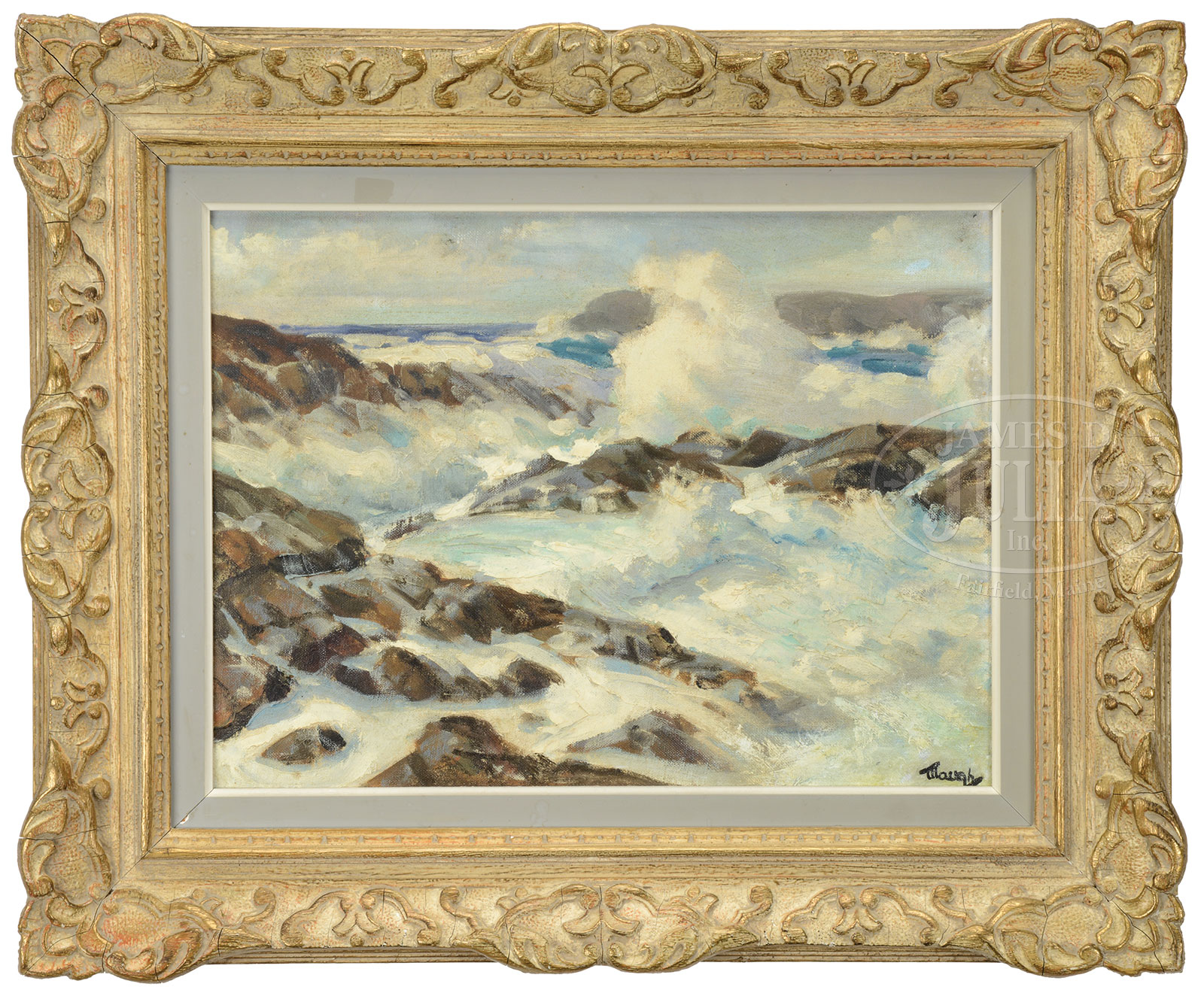 FREDERICK JUDD WAUGH (American, 1861-1940) WAVES CRASHING INTO TIDAL POOLS.Oil on canvasboard Housed in a partial gilt fancy frame with painted liner Signed lower right “Waugh” SIZE: 12″ x 16″. Overall: 18-1/2″ x 22-1/2″ CONDITION: Some surface dirt, good 52205-3 (1,000-2,000) – Lot 1490