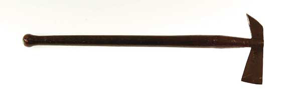 EARLY NAVAL BOARDING AX. 7-1/2″ blade, 2-1/4″ wide, with 5-5/8″ hand-forged ears attaching it to a 25-1/4″ handle. CONDITION: The tails of both ears are split and there is moderate pitting overall. There is some white paint under the over all varnish finish. FS758 4-47530 (800-1,200)