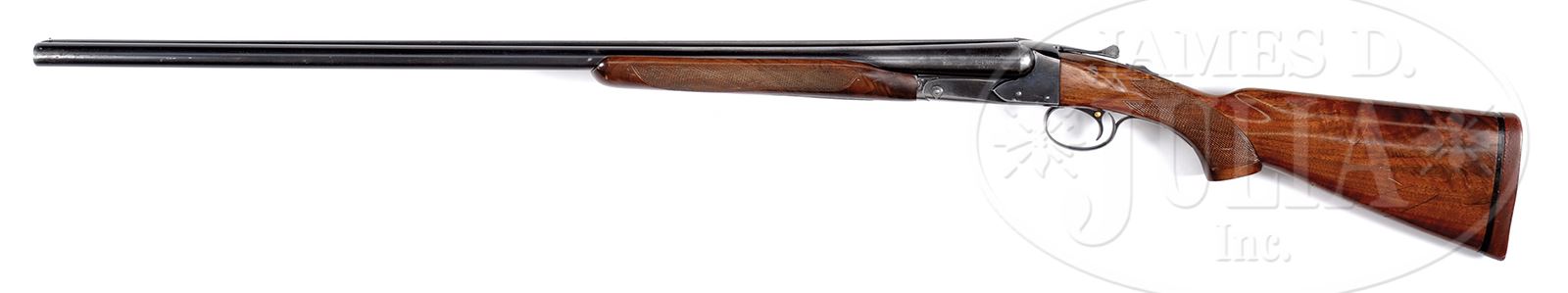 *WINCHESTER MODEL 21 DUCK GUN.SN 23636. 12 Ga. 32″ Bbls, 3″ chambers. CHOKE: FULL/FULL. Full length matted rib with steel front bead. Single selective trigger, automatic ejectors, automatic safety, full pistol grip buttstock checkered in two-point patter with 13-5/8″ LOP over “WINCHESTER” red pad. Beavertail forearm with roll-type release checkered in standard pattern. Un-engraved receiver marked “DUCK” on trigger plate. WEIGHT: 7 lbs, 12 oz. CONDITION: Very good. Bbls retain 75-80% orig blued finish with scattered handling marks and blue loss throughout. Receiver retains 75-80% orig blued finish, stronger on sides, toning on bottom. Trigger guard and forearm iron retain about half of their orig blued finish. Buttstock with scattered scratches and handling marks has been refinished and retains 85-90% of its restored finish. Black spacer in pad is cracked on left side. Forearm with scattered handling marks and scratches retains most of a restored finish. There is a tight crack on left side of forearm at muzzle end. Mechanics are excellent. Bores are excellent with light frosting particularly in left bore. 49417-59 JSL211 C&R (3,000-5,000) – Lot 1491