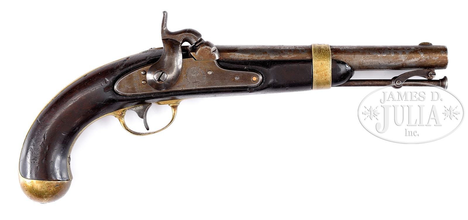 PALMETTO ARMORY SINGLE SHOT MODEL 1842 PISTOL, FAMOUS FAKE.SN NSN. Cal. 54. Palmetto Armory pistols are considered secondary confederate weapon though made for the state of South Carolina in 1853. This gun appears correct in configuration with no inspector marks on any parts. Bbl and lock markings are in the correct style “WM GLAZE & CO” and proofs “P / V / palmetto tree”. This gun however, is no doubt an early fake dating back to the 1950’s. Two excellent articles written about these clever fake pistols appear on pg 19 of the January, 1962 American Rifleman by well known collector Harry Knode. Later, a very scholarly article was written in the journal of The American Society of Arms Collectors, issue 74, pgs 74-80, by Peter A. Schmidt, well known antique arms authority. PROVENANCE: The Estate of G. W. “Bill” Stewart of Sonora, Texas. CONDITION: Fair overall. Markings are very good as can be seen in photos. Lock fit is poor with gap at top. At least one lock screw appears replaced. Brass has old cleaning and varnish with considerable wear. Iron overall is cleaned and gray overall with salt & pepper pitting. Stock is sound with numerous small blemishes and missing wood from burn out just behind bolster. Mechanically gun is functional with pitted smooth bore. 49973-71 JS (600-800) – Lot 1491 Click here to view provenance