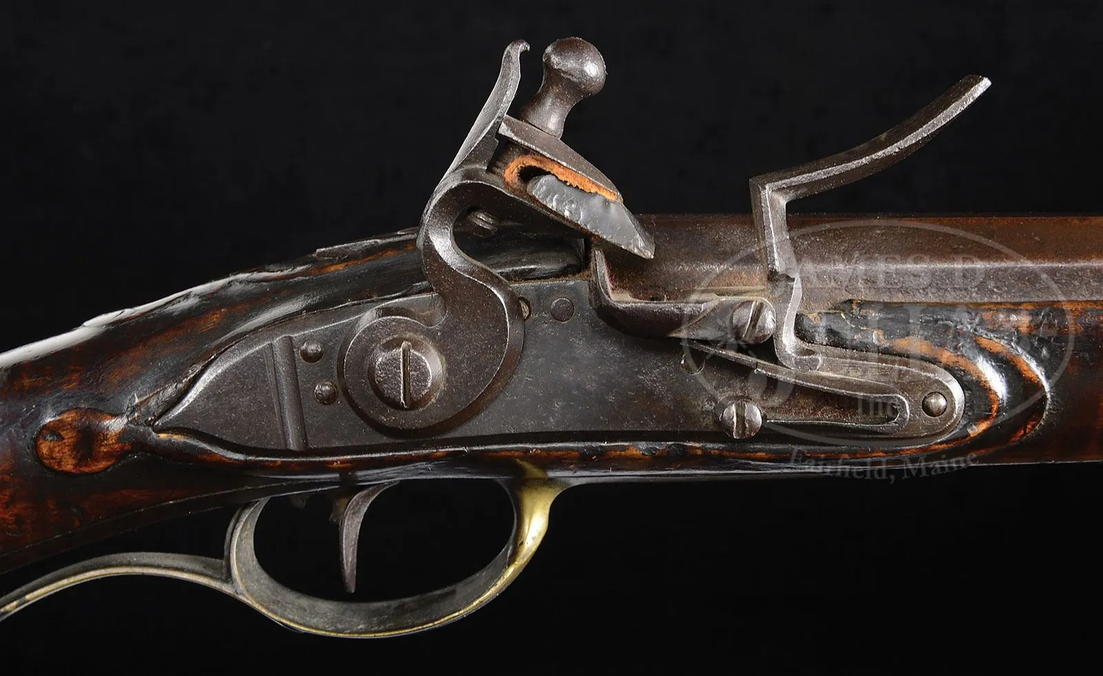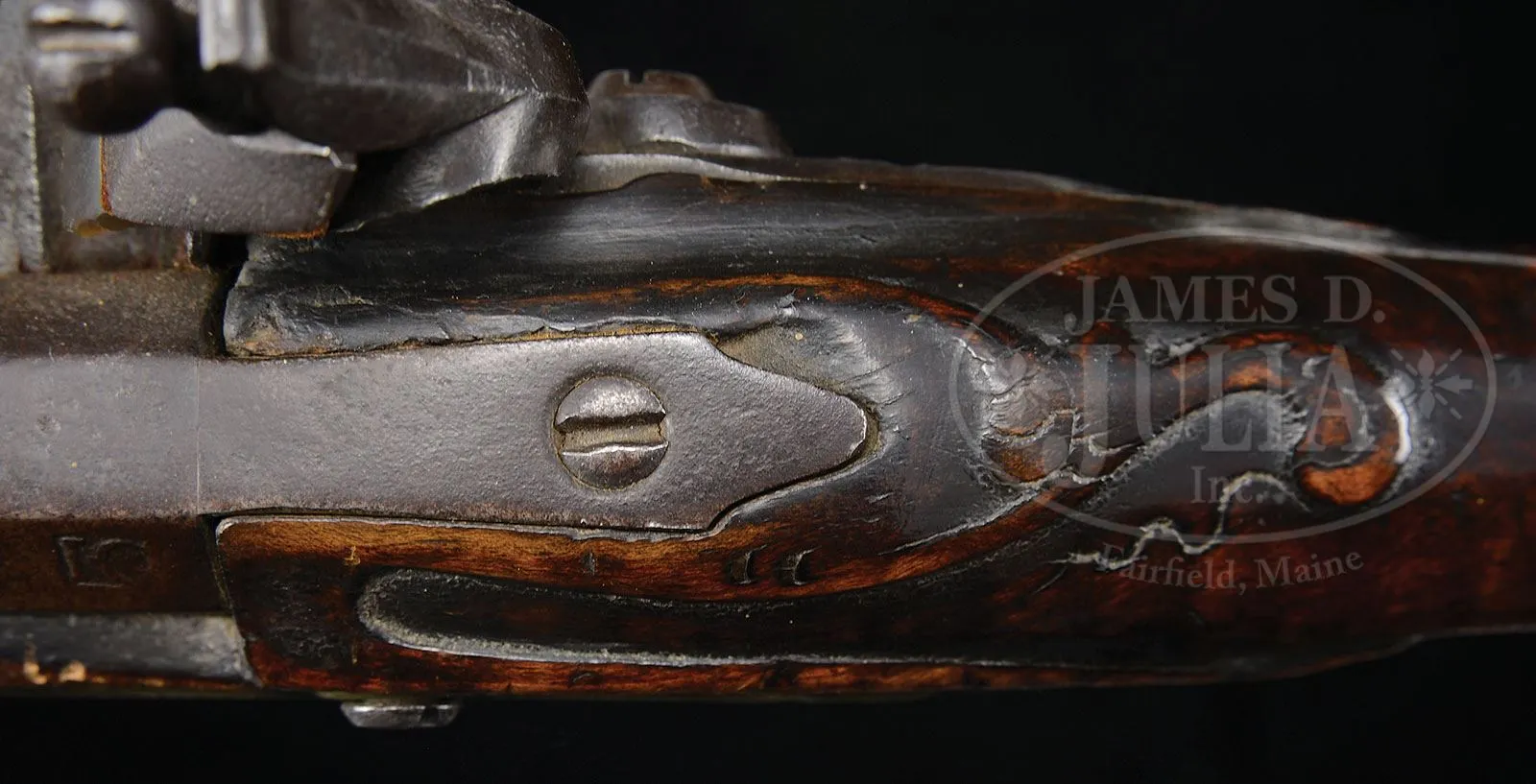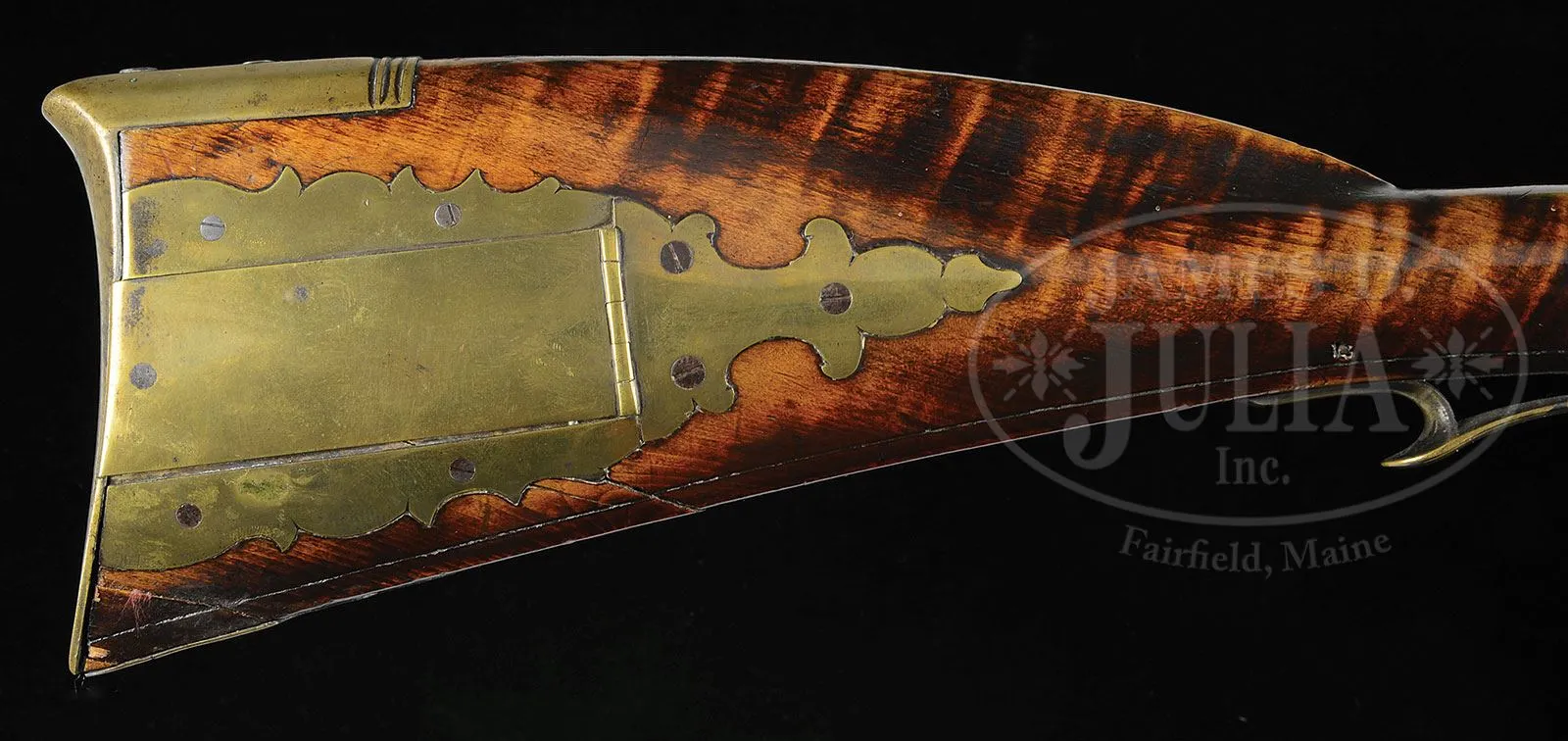 RELIEF CARVED CURLY MAPLE FLINTLOCK RIFLE ATTRIBUTED TO READING GUNSMITH WOLFGANG HAGA.SN NSN. 43-1/4″ full oct unsigned .530 bore bbl with 5 shallow square rifling grooves, held to stock with 4 bbl wedges. Overall 59″, butt is 4-3/8″ x 2″. Bbl is signed “IG” in a small square die stamp at same place on bbl as John Bonewitz signed his rifles “IB” and Andrew Figthorn signed his “AF”. This may be a mark of an unknown maker from this school or the man who made bbl. Nicely figured curly maple stock is relief carved to rear and forward of cheekpiece, around bbl tang and around rear ramrod entrance pipe. 4-pc Reading style patchbox is not engraved and heavy brass beveled sideplate is recessed at front screw, characteristic of Reading area rifles. Toeplate design is indicative of Haga’s style with its similarity to patchbox head. Relief carving on butt is very similar to that of rifle no.75 on p. 202 Kindig’s Thoughts on the Kentucky Rifle in it’s Golden Age which he attributed to Haga, but this rifle appears to be of earlier manufacture. Hand forged lock is unsigned. Of the four orig masters of Womeldsdorf-Reading School (Bonewitz, Reedy, Figthorn and Haga) all can be identified by existing signed examples with the exception of Haga. For this reason early guns of this school that cannot be identified by maker are generally attributed to Haga. Haga is listed as a gunsmith in Reading tax records beginning in 1767 and his will was probated in 1796 at which time he was referred to as a gunsmith. This gun is pictured on p. 40 of The Kentucky Rifle, a True American Herritage published by the Kentucky Rifle Association while it was in the Alfred Clegg Collection. PROVENANCE: Former collection of Ron Gable. Former collection of Alfred Clegg. Collection of Dr. Douglas Sirkin. CONDITION: Stock and finish are in fine orig condition throughout. Shrinkage and stress cracks under patchbox, and one on right hand side through third bbl wedge, none of which detract from the quality or appearance of this rifle. 4-50031 RG9 (12,000-20,000) – Lot 1492 Click here to view provenance