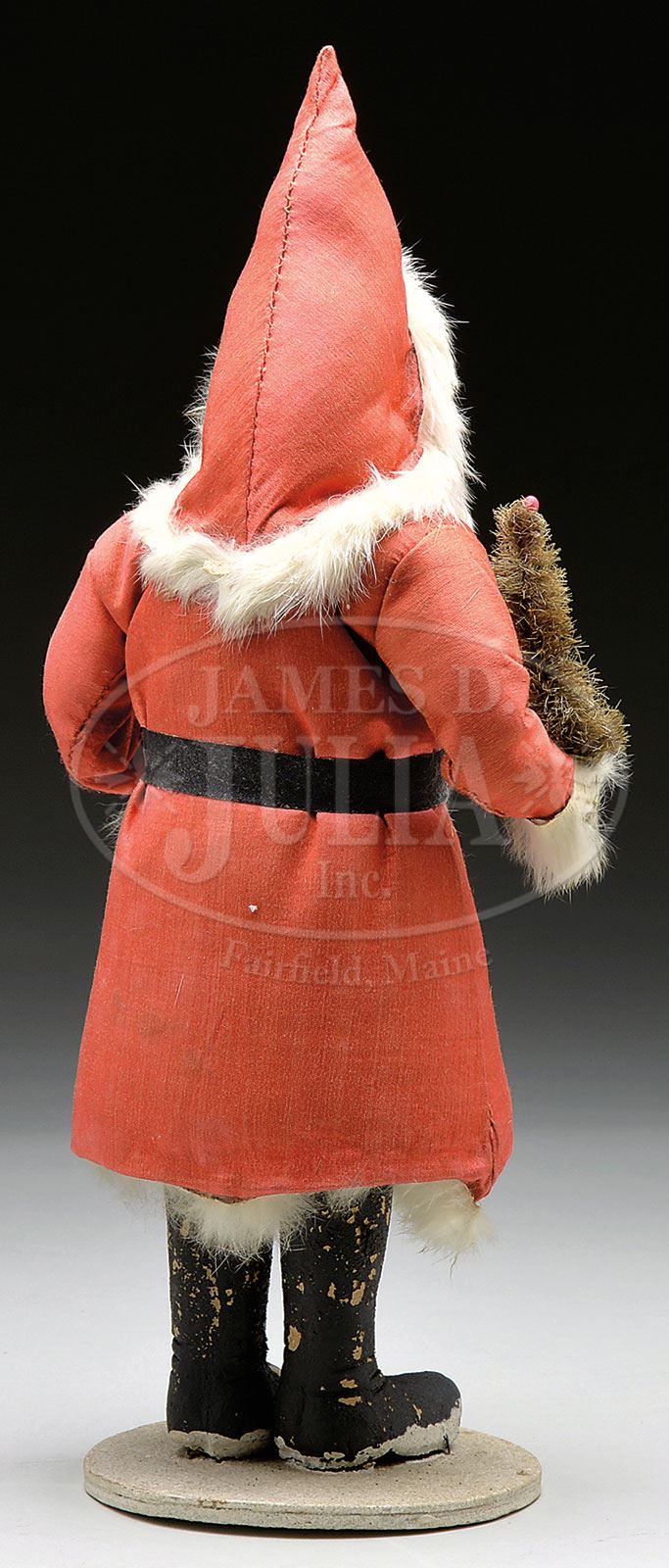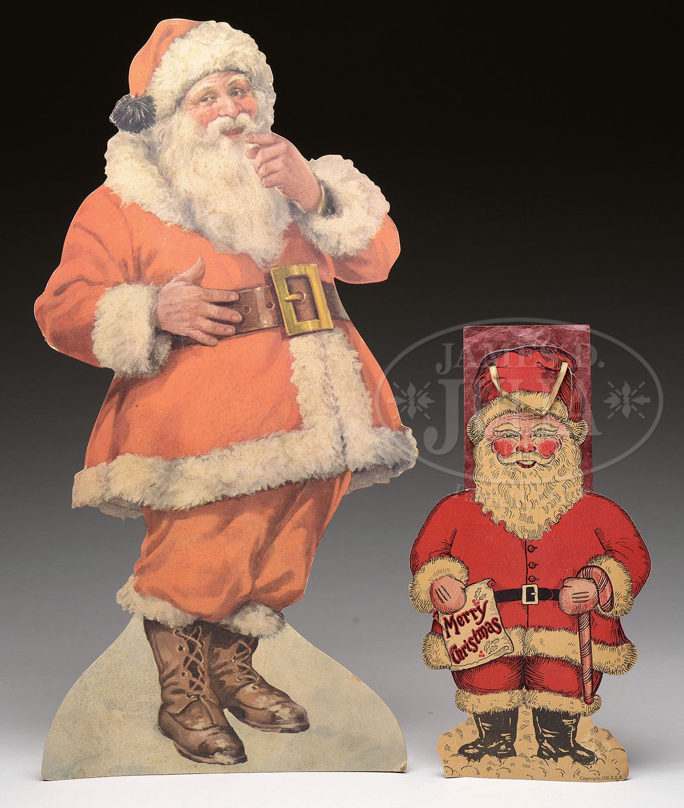 LOT OF SANTA CLAUS RELATED ITEMS.16″ candy container has composition head and hands on this conical shaped Santa with rabbit’s fur beard and trimmings with bottle brush style tree in hand. Body lifts to reveal paper candy container. Included are three Christmas die cuts; 1) Large cardboard die cut stand-up display of Santa (bottom third faded and worn from sun exposure with some holes and edge wear). 2) Smaller easel back version of the same image (overall very good with light soiling and a small crease at the top of his hat). 3) Lithographed cardboard goodie bag copyright 1926 with monogram B.E.R. (small tear with a couple vertical creases and a small corner piece missing). SIZE: Santa: 16-1/2″ t. Die cuts: 1) 62″ h. 2) 20-1/2″ h. 3) 12″ h. CONDITION: 1) Age unknown as base and boots appear old with face and upper part of body appearing contemporary. 2) As noted above. 1-13950, 1-13976 (400-600) – Lot 1492 Auction: Advertising, Toy & Doll Auction - Fall 2014 Please Note: All prices include the hammer price plus the buyer’s premium, which is paid by the buyer as part of the purchase price. The prices noted here after the auction are considered unofficial and do not become official until after the 46th day. |