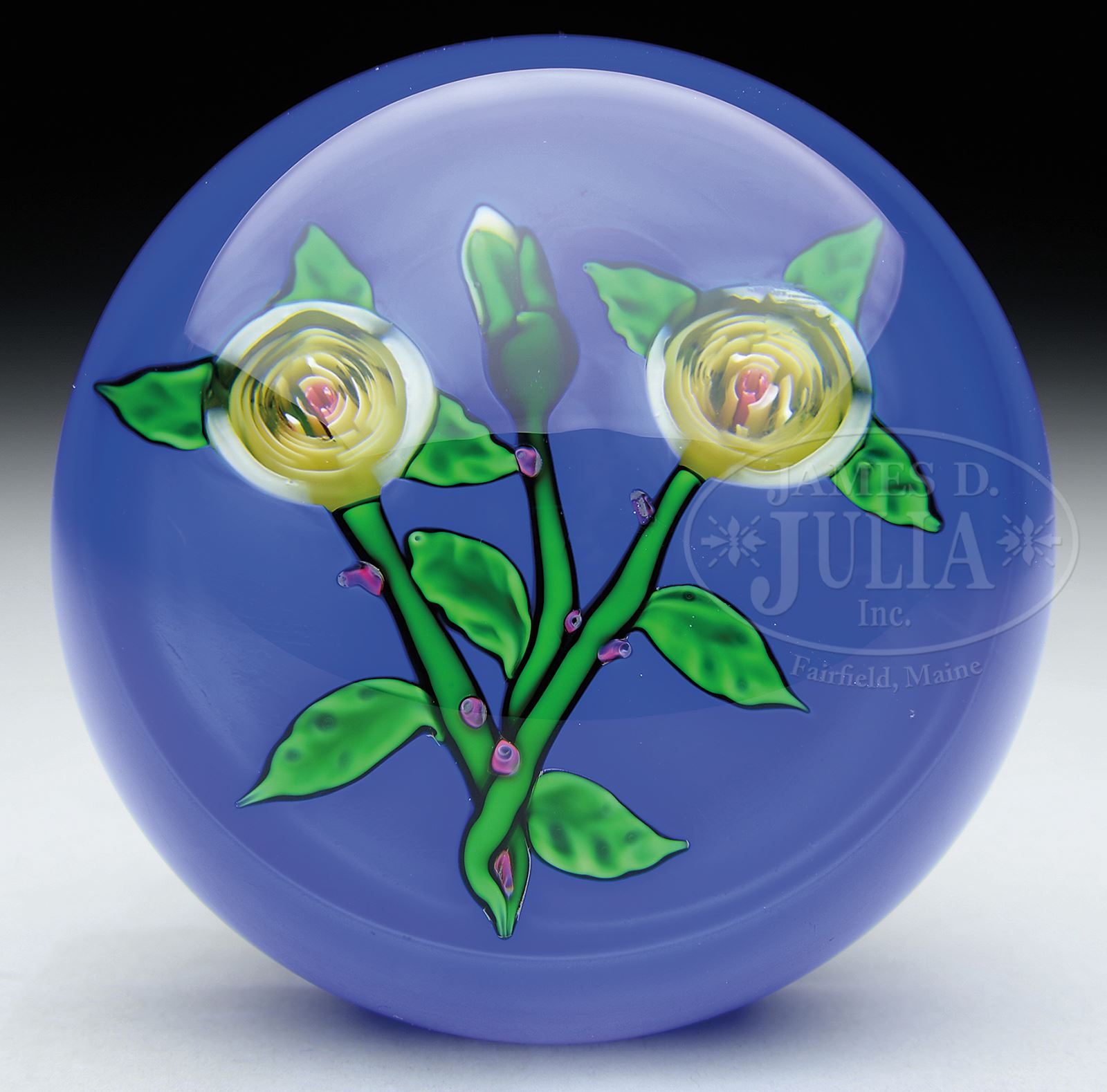 MODERN ST. LOUIS YELLOW ROSE PAPERWEIGHT.Modern St. Louis double yellow cane rose and bud paperweight with green stems and leaves on an opaque blue ground. Signed inside with a cane “SL 1976”. Comes with original box. SIZE: 3″ x 2-1/2″ deep. CONDITION: Very good to excellent. 50397-62 (300-500) – Lot 1493