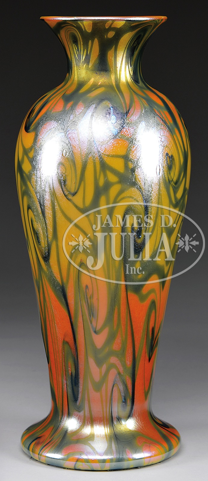 DURAND KING TUT VASE.Large Durand vase has green King Tut decoration against a gold iridescent background. Interior of the mouth is finished in bright gold iridescence and vase is signed on the underside “Durand”. SIZE: 16-1/2″ t. CONDITION: One small flake to edge of lip. Otherwise very good to excellent. 5-68379 (4,000-5,000) – Lot 1494