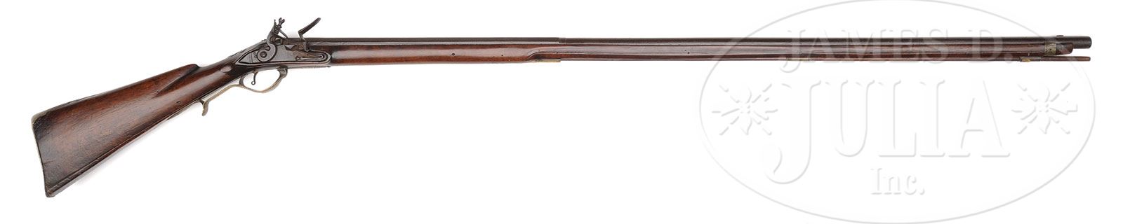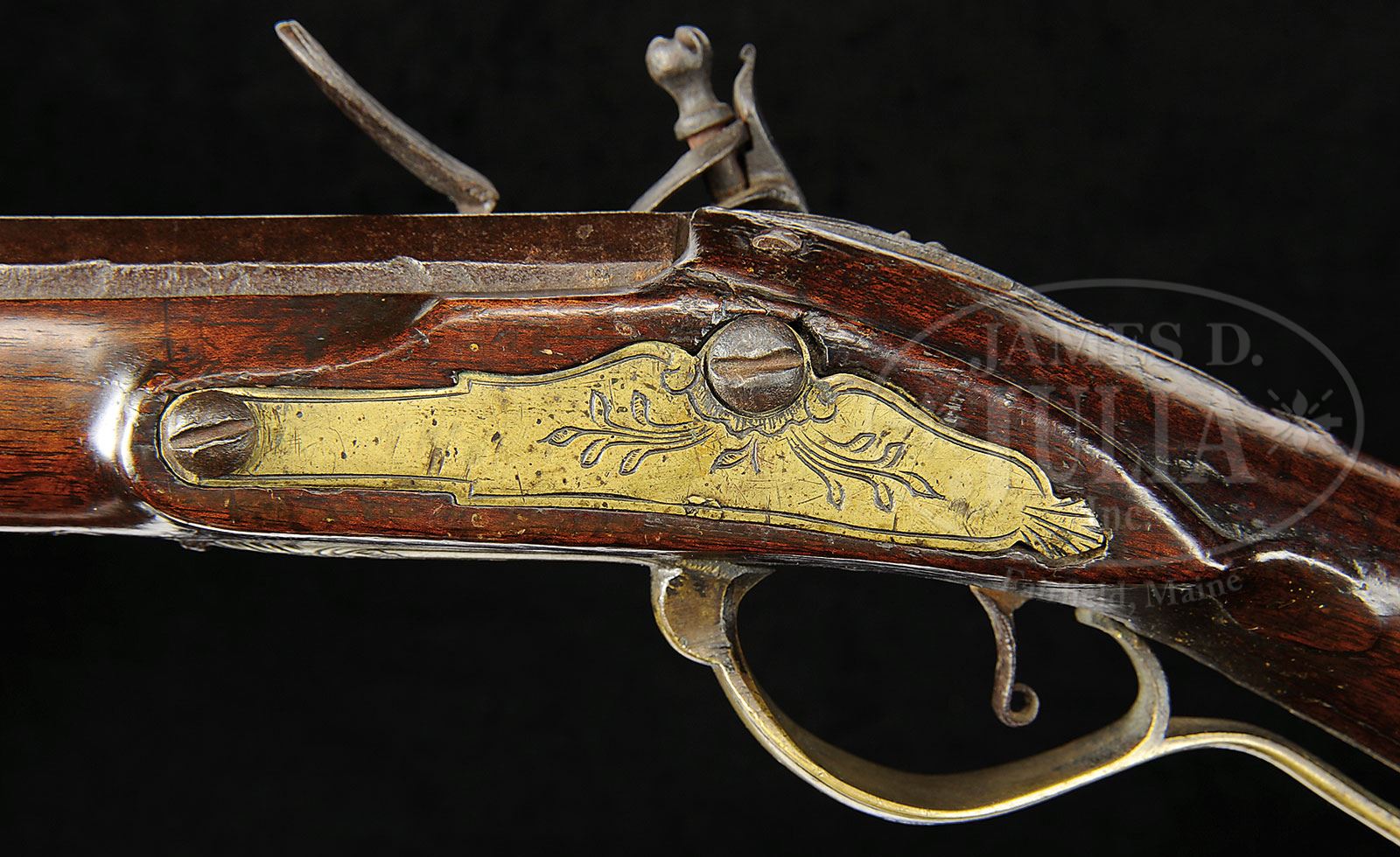 EXTREMELY EARLY PRE-REVOLUTION WAR PERIOD GERMANIC STYLE AMERICAN MADE FOWLER.SN NSN. Cal. 60 smooth bore. 47-1/2″ Bbl transitions from oct at breech with wedding band to rnd toward muzzle, and is unmarked. Hand-forged unmarked German style lock. Fine American walnut stock extends to within 1-1/2″ of muzzle, is pinned to bbl and has sheet brass wrap 1-1/2″ back from tip. There is a plain rebated molding along ramrod channel ending in incised foliate finial behind ramrod entrance ferrule. There is a similar incised carved design treatment forward of the front trigger guard flange. There are American style beavertails behind the lockplate mortises. Raised carved sprays of scrolled acanthus behind bbl tang as well as behind cheekpiece. There are staples for vent pick under cheekpiece. An incised line runs along sides of flat toe line. The buttplate trigger guard and sideplate are heavily engraved and of European style. New hickory ramrod. The cheekpiece is very heavy and pronounced, again in the European Germanic style. This gun has American wood, an American lock, no European proof marks and is most likely a Revolutionary War period American piece. PROVENANCE: Collection of Dr. Douglas Sirkin. CONDITION: Good. Bbl and lock are dark brown patina. Stock is smooth with fine hand wear. New pieces have been let in along bbl channel, mostly on right side. Some new wood has been let in around lockplate. A crack from rear lock screw above sideplate has been repaired using a hand forged nail. Furniture is a mottled light mustard color which is correct for the period. 4-49909 MGM281 (8,000-15,000) – Lot 1495 Click here to view provenance
