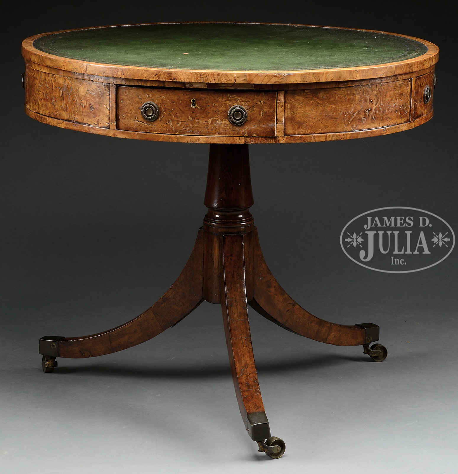 REGENCY YEW CENTER TABLE.Late 18th, early 19th century, England. The circular top with conforming green leather inset with impressed gilt floral border all within Birdseye cross banded edge. The apron fitted with four drawers alternating with rectangular panels, all with Birdseye figural surface, joined to and rotating on a ring turned cylindrical standard supported by down-swept tripod base terminating in brass capped casters. SIZE: 29-1/2″ h X 33-1/2″ d. CONDITION: Original leather top with 2 -3/8″ round scrapes and other minor blemishes- table structurally good with early replaced hardware. 9-96809 (1,500-2,500) – Lot 1495