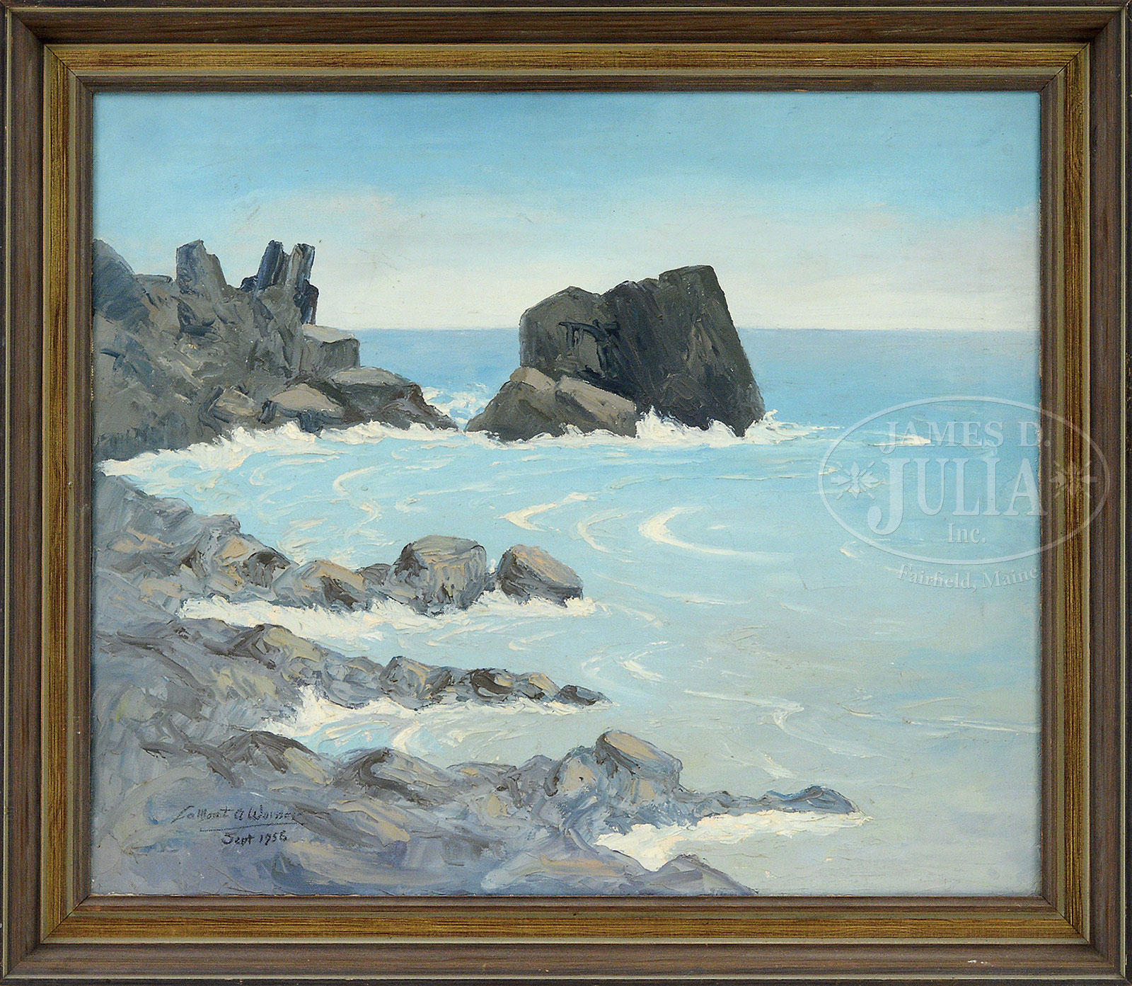LAMONT A. WARNER (American 1876-1970) ROCKY COAST.Oil on canvas Housed in a modern gilt decorated wood frame Signed and dated lower left “LaMont A Warner Sept 1956″ SIZE: 22″ x 26″. Overall: 26-1/2″ x 30-1/2”. CONDITION: Very good minor surface grime and right edge stretcher mark. 52278-6 (500-1,000) – Lot 1495