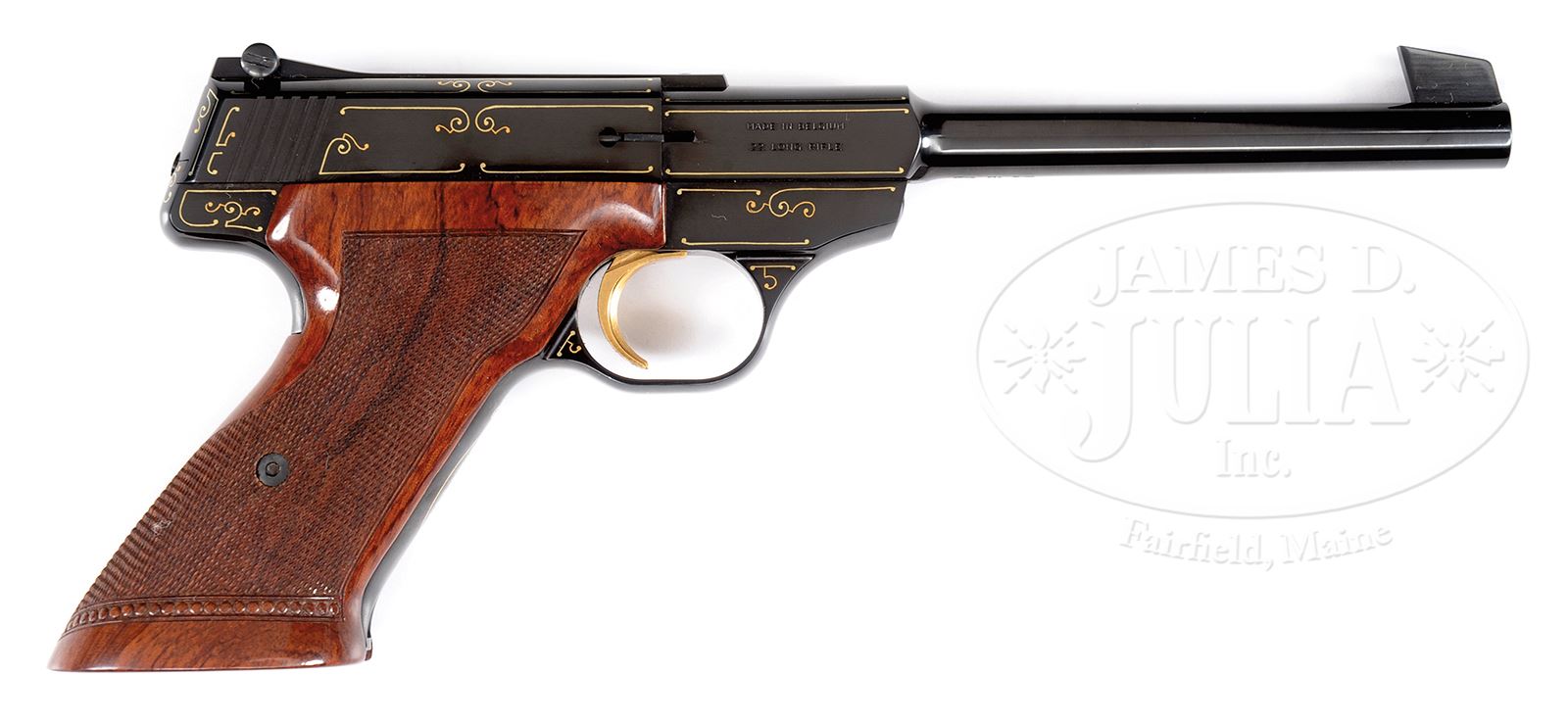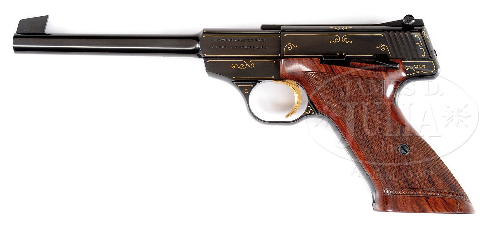 *BROWNING GOLD LINE CHALLENGER 22 LR.SN 17755U2. Cal. 22 LR. 6-3/4″ bbl. Beautiful little target pistol. Gold plated trigger, fancy checkered one piece cherry colored grip that are finely checkered with bead pattern around bottom. Frame and slide are nicely gold inlaid with line work and scroll on slide, frame and front strap. Engraved in near full coverage. SN on front strap. Wide blade front sight. No engraver signature noted. Comes with an orig instruction pamphlet and black faux leather Browning pistol case. CONDITION: Extremely fine. Retains most of its orig finish to both wood and metal with a few handling marks throughout. Has been fired, but appears to be well taken care of. Bore is bright and shiny. Mechanics are crisp. Pamphlet and case are very good. 49417-83 JSL306 (2,000-3,000) – Lot 1498