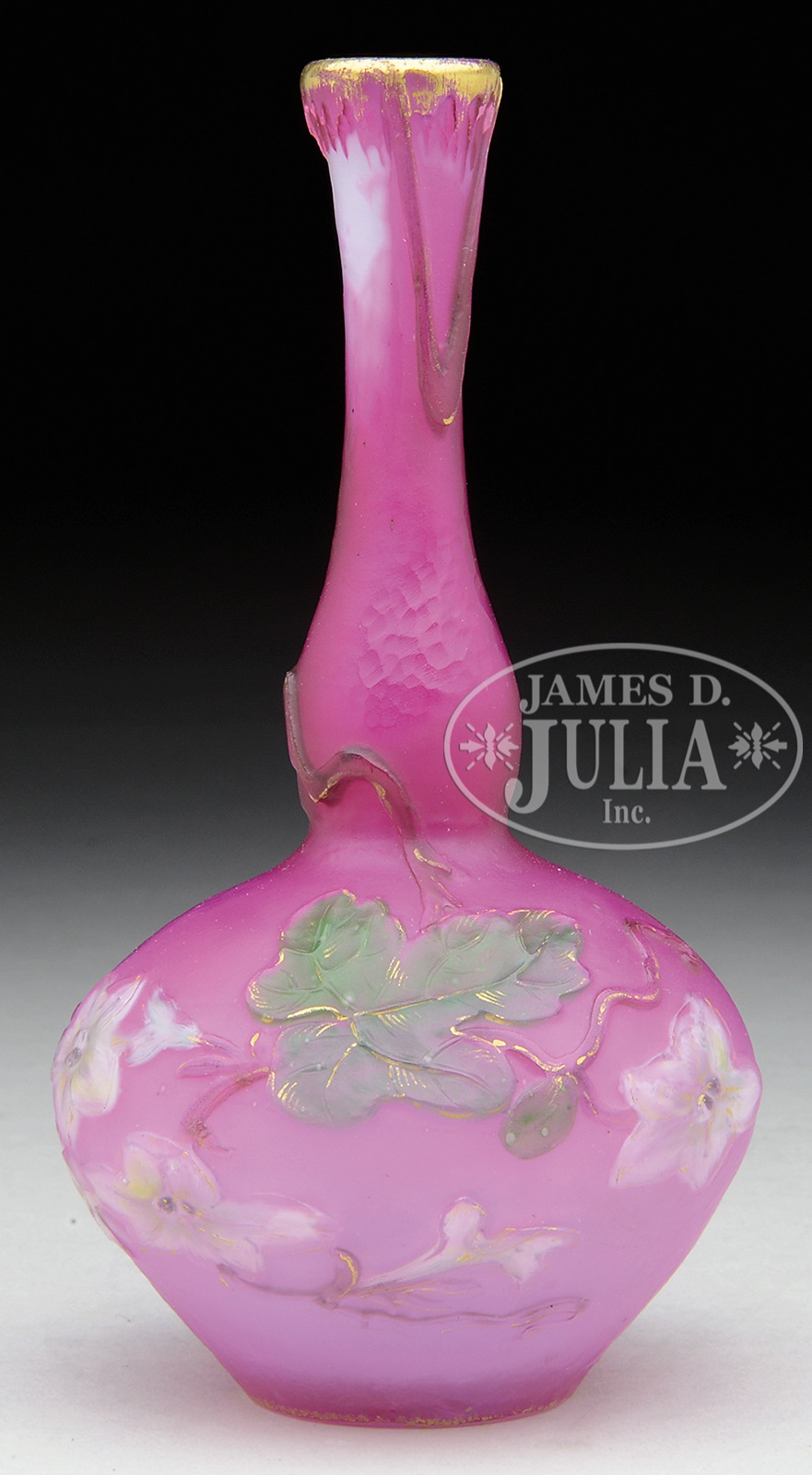 BURGUN & SCHVERER CAMEO GLASS VASE.Small Burgun & Schverer vase has cameo glass vine descending from lip leading to green wheel-carved leaves and white wheel-carved flowers with tendril circling side of vase. All against a shaded pink background. Vase is further decorated with random patches of martele and cameo icicles circling the lip. Signed on underside with gilt thistle mark “Verrerie D’Art De Lorraine BS&Co. Depose”. SIZE: 5-1/2″ t. CONDITION: Very good to excellent. 49808-12 (4,000-6,000) – Lot 1500