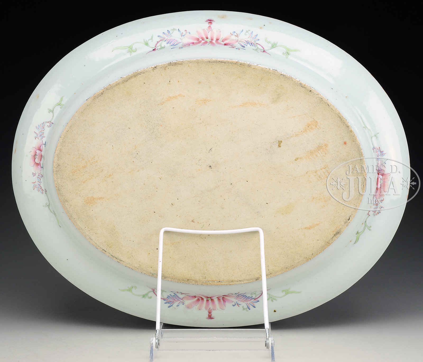 MILLEFLEUR PORCELAIN PLATTER.China, early 20th century. The oval platter handpainted in an intricate and colorful design of various flowers, all done on a black ground and accented with gilt scroll work vines. SIZE: 18″ dia. CONDITION: Very good. 50934-5 (400-600) – Lot 1500