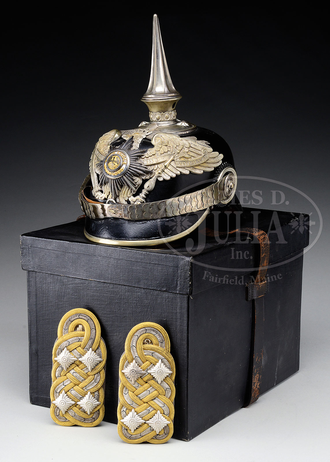 PRUSSIAN 1ST GUARD REGIMENT OF FOOT, I BATTALION (SEMPER TALIS), OFFICER’S MODEL 1897 HELMET, STORAGE CASE, AND FIELD MARSHALL SHOULDER BOARDS FROM THE ESTATE OF PRINCE HEINRICH OF PRUSSIA (BROTHER OF KAISER WILHELM II).Black lacquered leather helmet body with all silver metal trim. Helmet body has excellent form and firm stitching. Exterior lacquer finish shows minimal age crazing but in over all excellent condition. Interior has full elegant silk ribbon enhanced sweat leather and ribbed silk headliner. Silk headliner has the Gold embossed Royal Crown and letter “H” which is found on all items from the Princes estate. Interior visors are colored red in back and green in front. All metal trim is silvered as is proper for the elite 1st Prussian Guard Regiment. Frontplate is the silver frosted Prussian Guard Regiments Eagle with the highly vaulted silver enameled star of the Black Eagle order on the eagles breast. Above eagles head is the silver metal banner “Semper Talis” which were worn only by the staff and 1st Bat. of the 1st Guard Regiment of Foot. Flat silver chinscales mounted to helmet body with silver split brad rosettes. Officer 2 piece Reichs and Prussian cockade under chinstrap. Round spike base with fluted removable spike. Spike affixed to helmet body with 4 silver star attachments. 1st Prussian Guard of Foot was considered the elite regiment of the Imperial German Army. Helmet has no extra holes. Extremely rare Imperial German Helmet. Includes special square helmet carrying box with hand lettered name of Prince (All helmets from the Prince’s estate have the same helmet box). Also included a pair of original Shoulder Boards in the rank Of General Field Marshall with silver rank pips. All items were purchased directly from the House of the Hohenzollern family in Gut Hemmelmark (where Prince Heinrich lived until his death in 1929) in 2002. Elegant ensemble. PROVENANCE: The Doug Buhler Collection of Rare and Spectacular German Imperial Headgear and Pickelhauben; Helmut Weitze Certificate of Authenticity. CONDITION: Helmet, case and shoulder boards are in excellent condition. 51585-13 RT (20,000-35,000) – Lot 1501 Click here to view provenance
