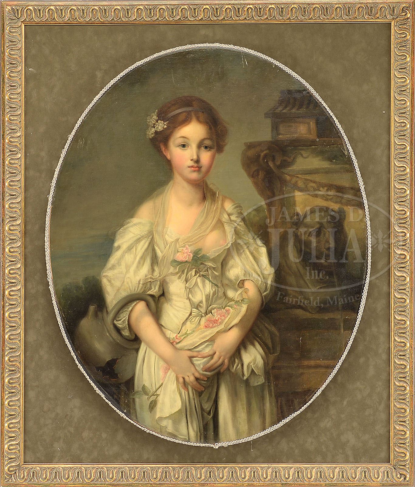 Please Note: This painting is after a famous artist Jean Baptist Great called the Broken Pitcher. ALICE UNDERWOOD FITCH (American, 20th Century) OVAL PORTRAIT OF A YOUNG WOMAN AFTER GREUZE. Oil on canvas Affixed to a modern rectangular frame with green velvet background Signed lower left “Underwood Fitch After Greuze” SIZE: 32″ x 26″. Overall: 39″ x 33″ PROVENANCE: From a fine Kentucky Estate. CONDITION: Relined, small scrape to upper center, otherwise very good 9-92884 (500-1,000)