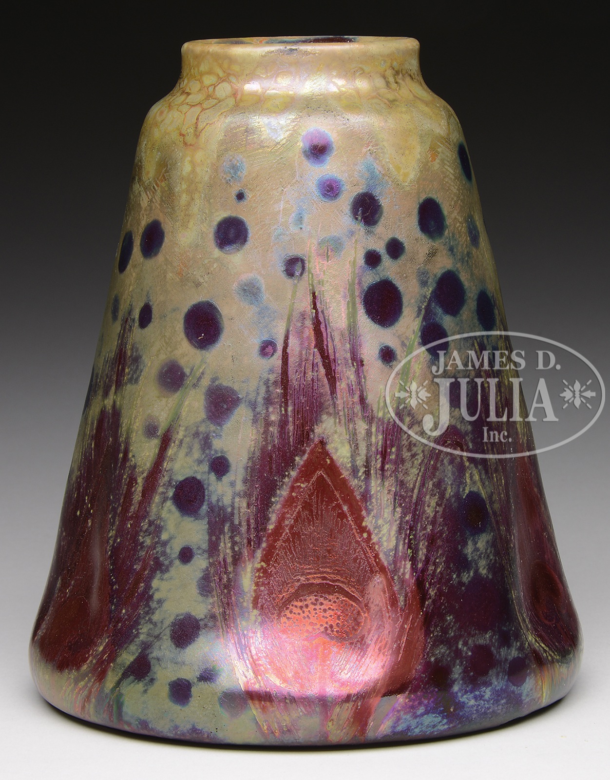 Clement Massier pottery vase is decorated with red iridescent peacock feathers extending from the foot against a mottled green iridescent glazed background. Vase is further decorated with various sized circles of purple iridescent glaze. Signed on the underside with impressed mark “Clement Massier”. Vase is also signed with light green glaze “Clement Massier”. SIZE: 6-1/2″ t. CONDITION: Very good to excellent. 47375-32 (4,000-6,000) – Lot 1502
