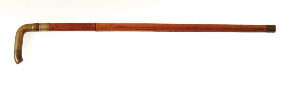 *CANE GUN. NSN. Cal. .410ga, 21-3/4″ round bbl. Simulated bamboo covering, the brass handle has been replaced. CONDITION: Many splits on the wood covering, traces of silver on the safety ring. Dark patina on the handle. 4-46106 FS479 (400-600)