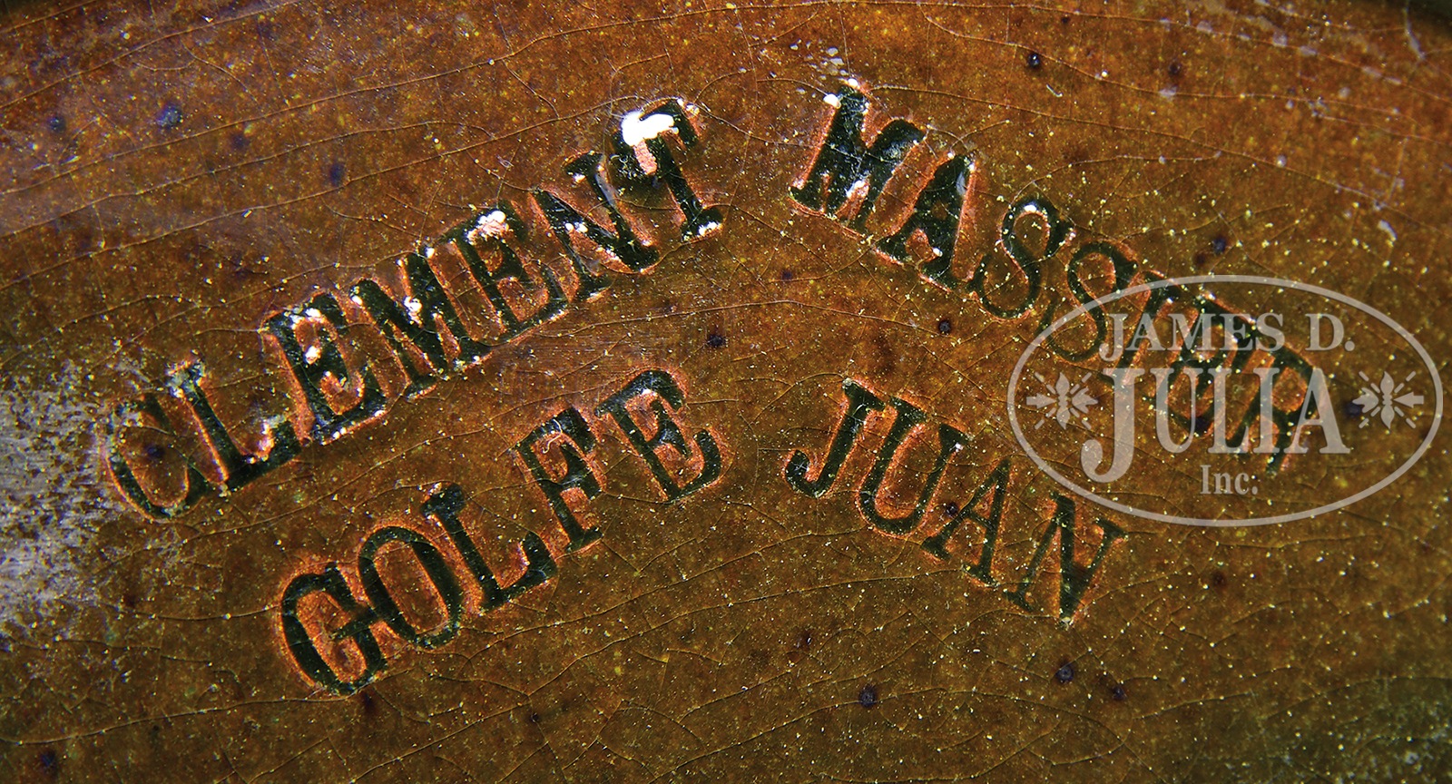 TWO CLEMENT MASSIER VASES.Clement Massier pottery vases are hand decorated with a colorful thistle design against a rich green background with gilded shading. Each vase is signed on the underside with impressed signature “Clement Massier Golfe Juan”. SIZE: 15-3/4″ t. CONDITION: Very good to excellent. 47375-23 (3,500-4,500) – Lot 1503