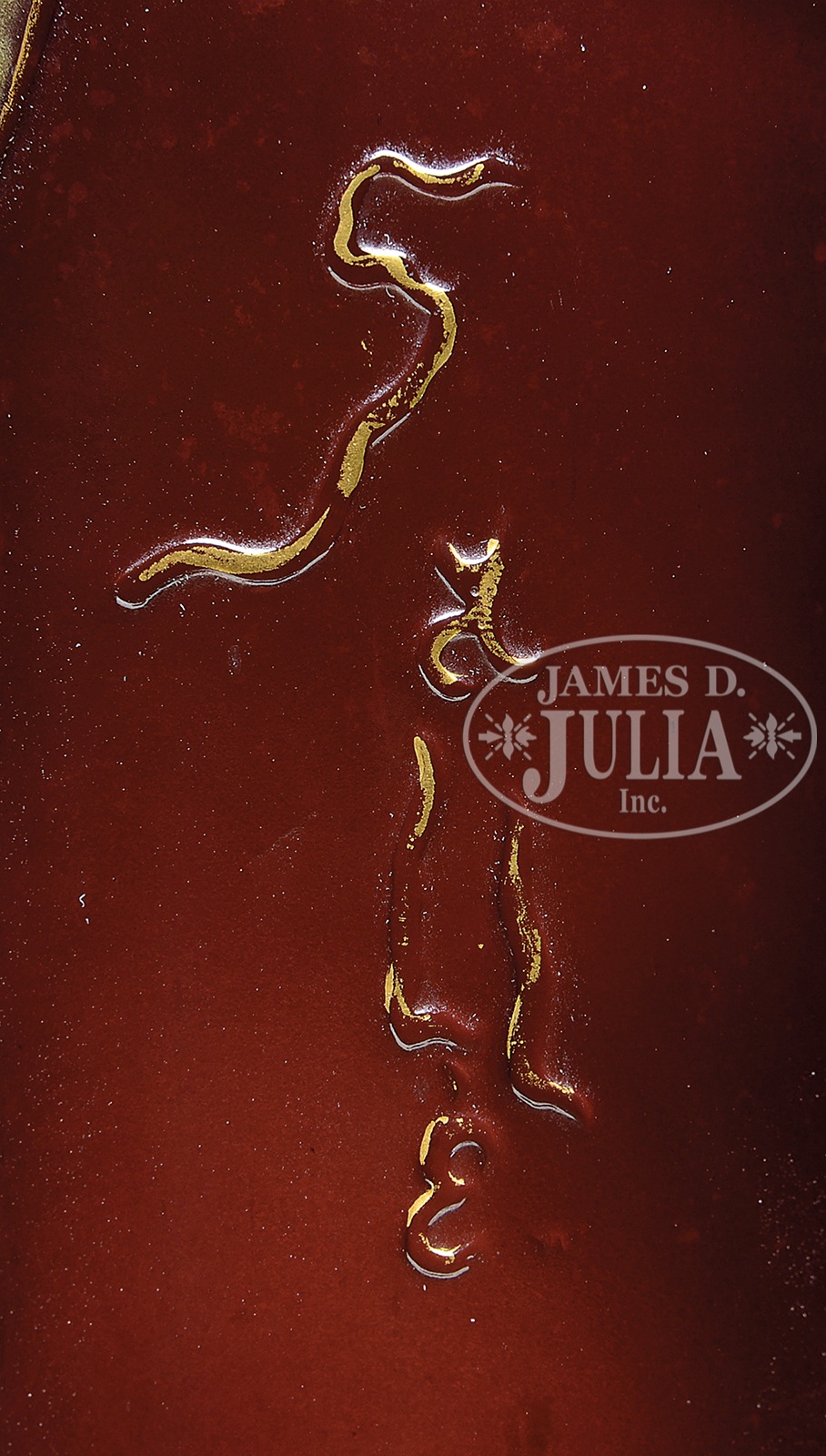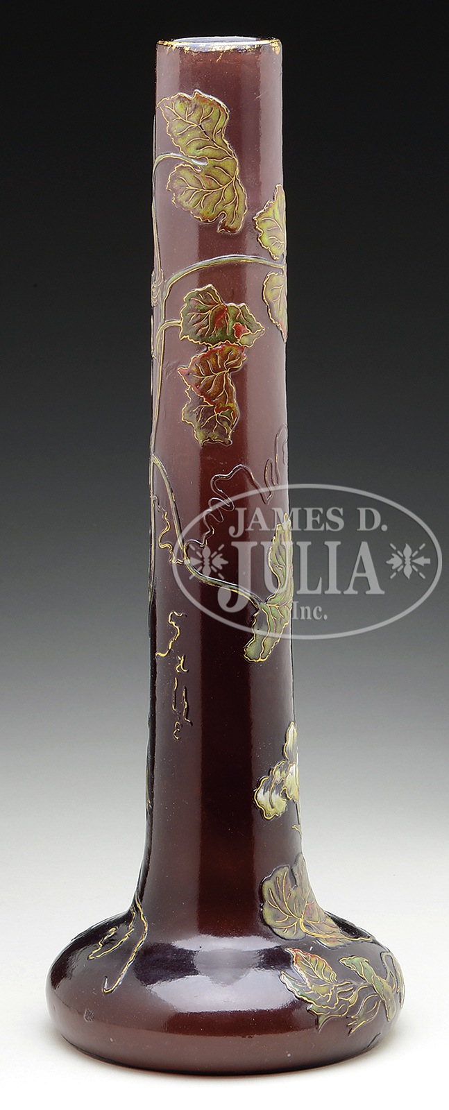GALLE CAMEO AND ENAMELED VASE.Galle vase has cameo decoration of a squash vine, leaves and blossoms encircling the body and long slender neck of vase against a rich amethyst background. Cameo decoration is heavily enameled with yellow and white blossoms, shaded green leaves with red and brown highlights. Vine, flowers and leaves as well as cameo tendrils have gilded detail. Signed on side in gilt cameo “Galle”. SIZE: 18″ t. CONDITION: Very good to excellent. 49779-1 (7,000-9,000) – Lot 1505