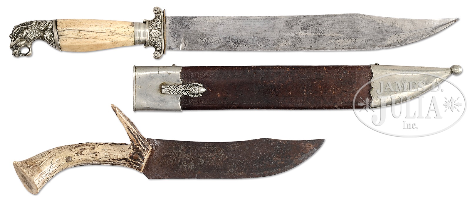 TWO FINE NINETEENTH CENTURY BOWIE KNIVES.(1) Massive German made 18″ overall clip point Bowie knife made for South American market with shaped octagonal polished bone grip, German silver mounts with monster head pommel, fine original tooled sheath with German silver mounts. Blade measures 11-3/4″ with 4″ clip. (2) Skinning knife with unusual makers mark hand engraved on blade “Made By J. E. Carr”. Grip is split polished antler retained by 2 copper peened over pins. Knife measures 12-1/2″ overall with 7-3/4″ blade. CONDITION: Very good to fine overall, German Bowie shows old sharpening with makers mark worn but mostly discernible, overall gray/bright with pitting, sheath is sound, solid with craquelure to surface, well patinaed polished bone grip has several hairline cracks with chipping at base. Skinner exhibits blade with light sharpening to edge, traces of original luster being mostly a mottled brown with staining and pitting, grip is very good with hand worn patina. 49975-1 JS (2,000-3,000) – Lot 1507