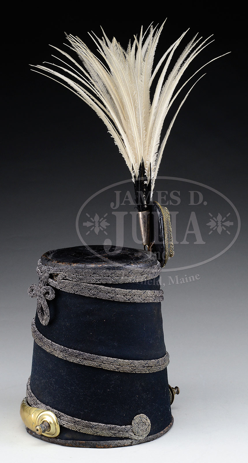 PRUSSIAN MODEL 1843 OFFICER’S HELMET FOR THE 1ST LIFE GUARD (LEIB) HUSSARS REGIMENT.Tall elegant helmet made of black patent leather covered with bands of white and silver cloth that are the colors of the regiment. The cloth bands are unwrapped and allowed to flow in the wind while riding on festive occasions. Covered with black cloth that wraps around the exterior of the helmet. Front plate is a silver skull with cut out eye holes and nostrils that are backed with black velvet. Gilded rounded chinscales mounted with rosettes attached to helmet with domed screws. Interior has elegant officer leather lining of the period. Hooked attachments for “fangschnur” on top of helmet. Includes officer lanyard and bullion field badge. Damaged card-de-visite glued inside “Baron von Stosch Hussar Regiment”. Very lightly worn and in untouched and unaltered condition. Extremely rare helmet. PROVENANCE: The Doug Buhler Collection of Rare and Spectacular German Imperial Headgear and Pickelhauben; Certificate of Authenticity from Helmut Weitze. CONDITION: Excellent. 51585-1 RT (7,500-10,000) – Lot 1507 Click here to view provenance