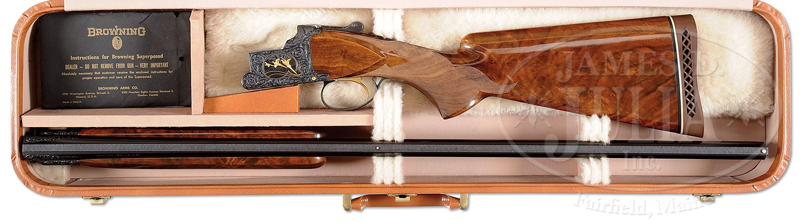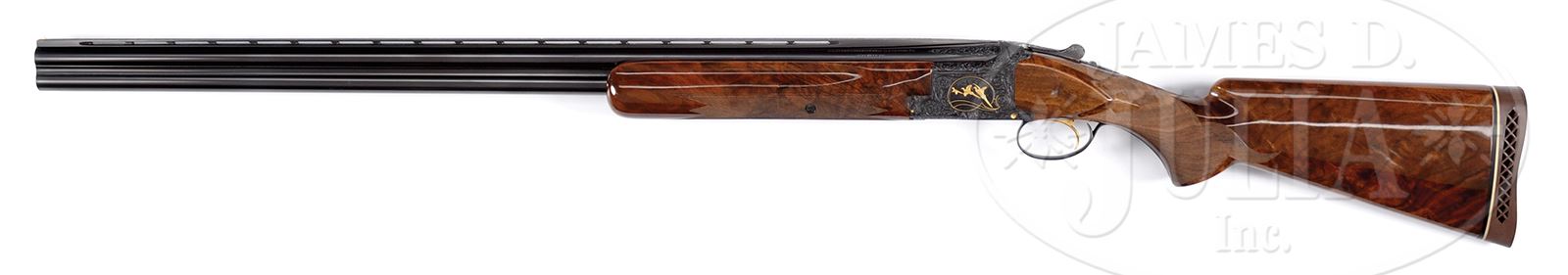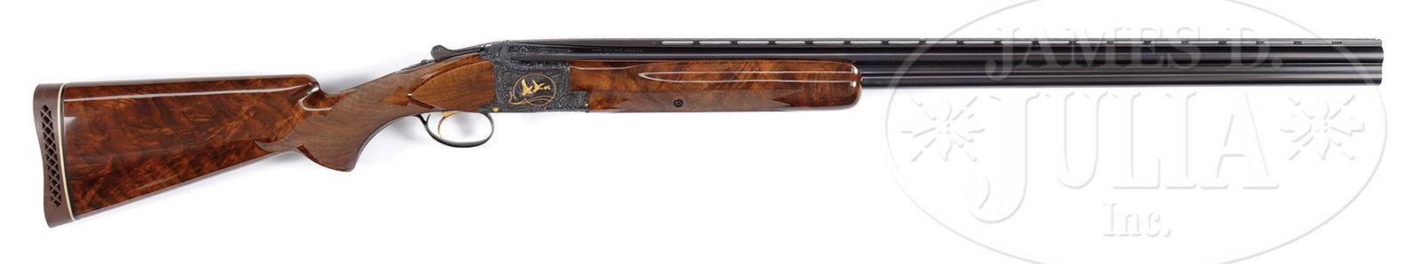 *BEAUTIFUL BROWNING MIDAS 12 GA.SN 47228S5. Cal. 12 Ga. 32″ Bbls. 2-3/4″ chambers. Choked: Full/Full. Full length matted low profile ventilated rib with “certifiable pre-ban ivory” mid and front bead. Gold plated single selective triggers, automatic ejectors, non-automatic safety. Stock is FKLT configuration, checkered in standard Midas grade point and leaf pattern with 14-9/16″ LOP over Browning white lined waffle pad. Forearm checkered in five point pattern. Receiver is beautifully scroll and floral engraved with gold inlays of pheasants in wood scene on left and gold ducks in marsh scene on right. Bottom of frame with gold inlaid quail all surrounded by beautifully executed floral and scroll pattern. Signed on both sides “A. DIERCKX”. Wood has incredible grain and color. Accompanied by Browning hard case. Weight: 8 lbs 7 oz. PROVENANCE: The Collection of Robert Burg. Special Note: This item contains or is made of ivory. Do not bid on this lot unless you have read and agreed to our "Ivory Position Statement" and the "Waiver of Legal and Financial Risk to James D. Julia in regards to your Purchase of an Ivory Object." This information is located in the front section of our catalog. CONDITION: Extraordinarily fine, near new retaining nearly all factory orig finishes to both wood and metal. Likely test fired only. Case is excellent. Brilliant shiny bore. Mechanics are crisp. With a combination of exceptional engraving, exceptional wood, and exceptional condition it would be hard to improve upon this Midas. 49503-4 JSL290 IVORY (5,000-8,000) – Lot 1510 Click here to view provenance