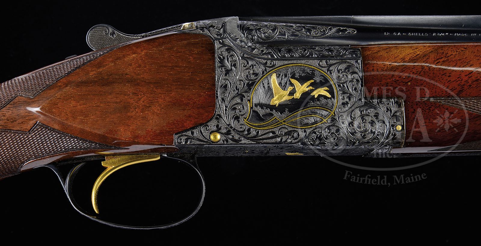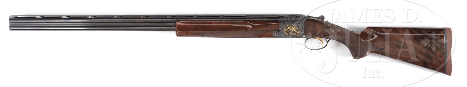 Great News: This gun will letter as a Midas Grade! *BROWNING MIDAS GRADE BROADWAY TRAP.SN 2113 S9. Cal. 12 Ga. 32″ bbls. 2-3/4″ chambers. Choked: MOD/FULL. Full length matted Broadway low profile ventilated rib with twin “certifiable pre-ban ivory” beads. Gold plated single selective trigger, automatic ejectors, non-automatic safety. Stock is FKST configuration, 14-1/4″ LOP over red serrated “KICKEEZ” pad with small black spacer. Trap forend, checkered in standard Midas 3-point checkering pattern. Buttstock checkered in standard Midas pattern with point and leaf pattern through grip. Receiver fully and finely scroll and floral engraved and gold inlaid. Left side with 3 pheasant in gold surrounded by fancy gold line work. Bottom of frame with quail in flight in gold. Right side of frame with 3 ducks in flight in marsh scene, also surrounded by gold. Overall this gun is exquisitely engraved with beautiful shading in background of scroll throughout. Trigger guard bow fully engraved with shield that is absent of initials. No engraver signature noted.Weight: 8 lb 6 oz. PROVENANCE: The Collection of Robert Burg. Special Note: This item contains or is made of ivory. Do not bid on this lot unless you have read and agreed to our "Ivory Position Statement" and the "Waiver of Legal and Financial Risk to James D. Julia in regards to your Purchase of an Ivory Object." This information is located in the front section of our catalog. CONDITION: Extremely fine, near new. Retaining 98-99% orig blued finish to bbls, frame, trigger guard and forearm iron. Buttstock and forearm both excellent with minor handling marks. Finish on left side of buttstock, though vibrant, has turned slightly cloudy but does not detract from gun. Mechanics are excellent. Bores bright and shiny. Beautiful high art Superposed trap gun. 49503-49 JSL90 IVORY (5,000-8,000) – Lot 1512
