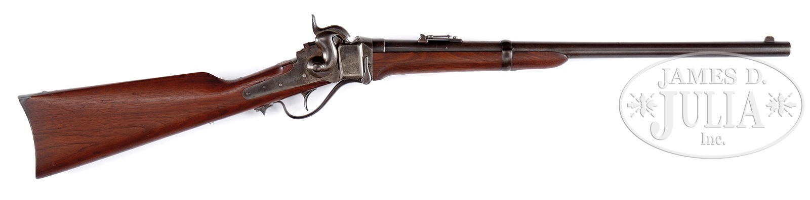 SHARPS NEW MODEL 1863 CARBINE.SN C20769. Cal. 52 percussion. 22″ bbl. Blue and case colored finish. Straight grained American walnut stocks. Bbl has standard sights. Sharps address in front of rear sight. “NEW MODEL 1863” behind rear sight. Inspector mark “E.A.W.” on left breech of bbl. Rear sight has Lawrence patent mark. Receiver has Sharps patent mark on left side, Lawrence patent mark on right side behind hammer and “C.SHARPS’ PAT. OCT. 5 1852” on lockplate. Receiver has military inspector initials. Saddle ring mounted on bar. “J.E.C” inspector initials on bar. Buttstock has “WAT” inspector cartouche on left side opposite hammer. No apparent marks on forestock. PROVENANCE: The Estate of G. W. “Bill” Stewart of Sonora, Texas. CONDITION: Very good to fine. Bbl retains an even plum-brown finish overall with sharp markings. Bbl has a few slight scratches on top. Sights are very good with sharp markings. Bore is bright with strong rifling. Receiver retains silvered out case colors overall that blend to a pleasing gray-brown patina. All markings are sharp. Lever is a gray-brown patina. Stocks are excellent with very few handling marks and a very crisp inspector cartouche. Buttplate is an even silver-gray patina with some traces of case color. Screws are fine. This is an opportunity to obtain a model 1863 Sharps carbine in the orig percussion configuration as most of this model were converted to metallic cartridge after war. Appears un-issued. 49973-490 TEP (3,500-5,500) – Lot 1512