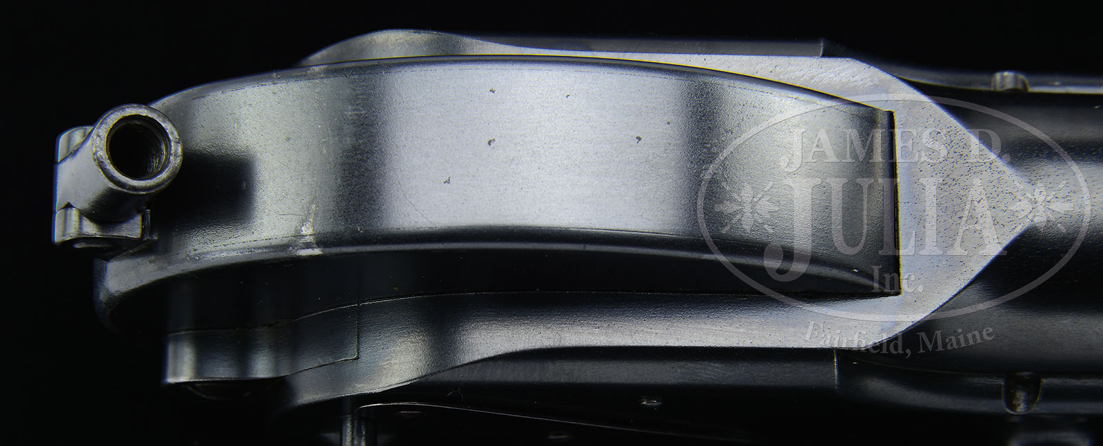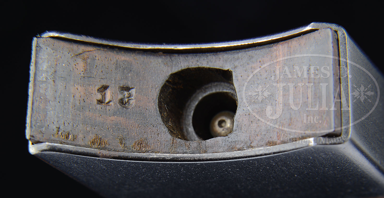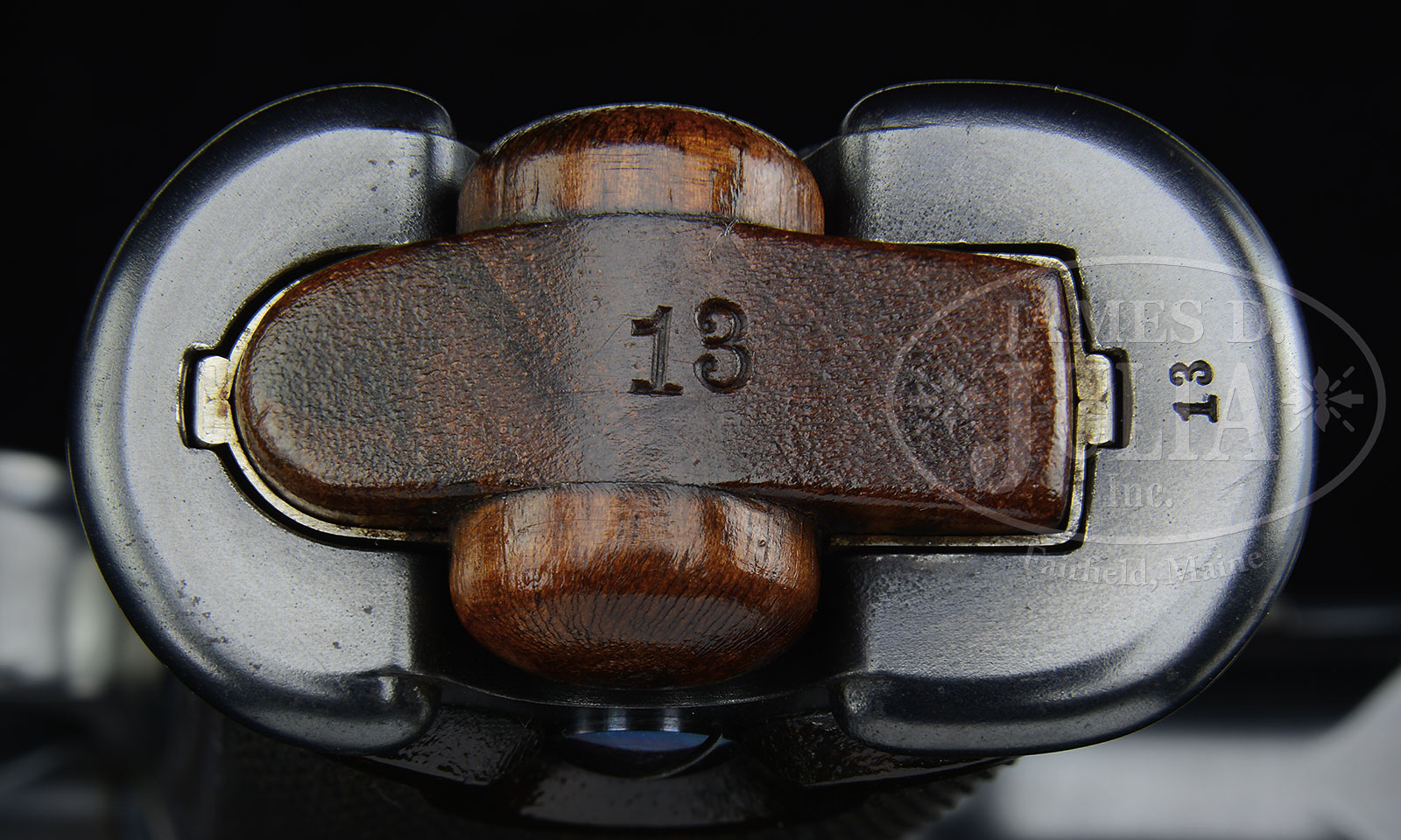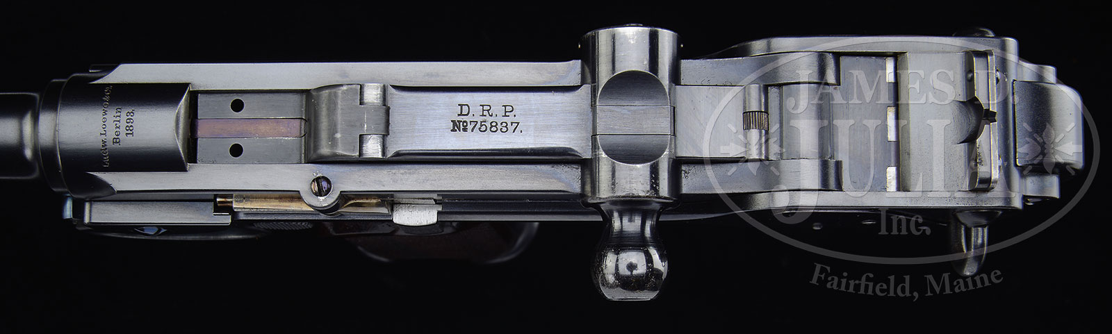 SN 13. Cal. 7.65 mm. This is a very unusual Borchardt in several respects. Unlike a number of other pistols in this serial range that have a sear retained by a separately affixed spring, this gun has the later type sear. There are no proofs on bbl or toggle train, whose breech block is in-the-white. Similarly, there are no markings on right side of receiver. All the numbered parts are “13”, including the trigger plate, trigger, and right grip panel (left is unnumbered). The bbl is numbered “30” and is 7-1/2″ having pinned front sight and blade rear sight secured by two screws. Top of chamber marked “Ludw. Loewe & Co. / Berlin / 1893.” and “D.R.P./No75837.” on center toggle link. The main point of interest centers about the unusual attachment at the rear of the main spring housing. Instead of the usual lug, this pistol has a rotate-able tube that slips into a recess of the skeletonized shoulder stock. This unique form of stock and attachment is shown in early Borchardt literature. Rotating the serrated wheel advances a threaded screw to lock the back of the main spring housing onto the front of the matching numbered stock. At the rear of the stock is a loop for a shoulder strap, presently fitted with a modern replacement, that connects to the loop on the left side of the receiver. The ensemble comes with three original magazines, all with matching SN “13”, wooden hold open, wood screw driver handle with two blades, small oil bottle, and a larger grease tin marked “Virginia – Fett / Marked for Petri & Stark, Offenbach A/M”, and a pin punch. All components contained in an original period oak box, lid lined in green baize, whose base is lined in dark green felt and compartmentalized for the pistol and all accessories. Lid is secured with two rotating clasps and centered keyed lock. PROVENANCE: The Friedrich-Wilhelm Dauphin Collection – Germany. CONDITION: Pistol retains an amazing 99+% orig blue with the associated small parts and grips in the same condition. As mentioned, the breech block is in-the-white, most of the wear appearing on each side of the cocking knob and slight fading on the forward face of trigger and the right mainspring housing cover plate. Mirror bore and perfect manual mechanics. Comparable condition shoulder stock and each of the mags that show minor oxidative flecking on each side of their bodies. The dummy mag that appears near new, is of a very rare type seen in only one other cased early Borchardt. Near excellent screw driver handle and VG punch whose surface has been lightly cleaned. A spectacular, super low SN Borchardt, with experimental skeletonized shoulder stock and accessories, in beautiful period, deluxe presentation case. 49828-3 LMA (50,000-100,000) – Lot 1516