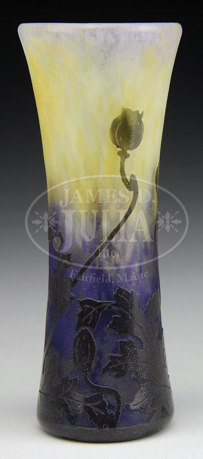 DAUM NANCY WHEEL-CARVED POPPY VASE.Well executed Daum cylindrical vase with flared rim has rich green cameo leaves, stems and two buds encircling the body of the vase, with a single padded and wheel-carved red poppy flower, set against an acid-textured background of richly mottled purple, yellow and white. Vase is signed with cameo signature “Daum Nancy” and Cross of Lorraine on side of vase. SIZE: 6″ t. PROVENANCE: Rudd Collection, Chicago, IL from Pinhaus Collection, Los Angeles, CA. CONDITION: Very good to excellent. 51894-31 (5,000-7,000) – Lot 1518