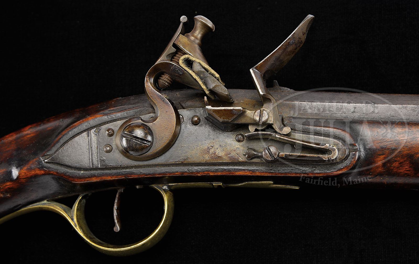 Please Note: The pistol is reconverted from percussion. EARLY 18TH CENTURY CURLY MAPLE FLINTLOCK AMERICAN PISTOL.SN NSN. 9″ full oct unmarked 41 Cal. smooth bbl pinned to curly maple stock. Overall 14-3/4″. Brass trigger guard and ramrod ferrules are of early American design. Unique grip curves inward and ends in a flattened ball. Lock is very early hand forged German style. All indications are this is a very early, possibly Revolutionary War era pistol. PROVENANCE: Ex-John Laidacker Collection. Collection of Dr. Douglas Sirkin. CONDITION: Fine. Complete and working with only minor surface dings and scratches. 4-49951 RG50 (8,000-10,000) – Lot 1519 Click here to view provenance