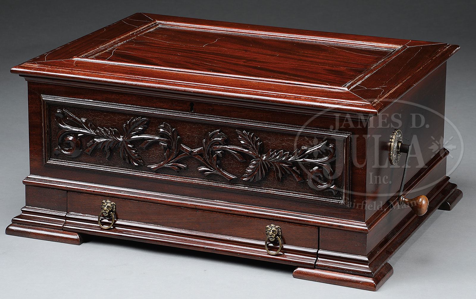 17-1/4″ STELLA DOUBLE COMB MUSIC BOX.Nice big mahogany case with drawer in base for record storage. Nice heavy molding around base & lid, with large carving (24″ x 5-1/2″) on front. Mechanism is nicely restored and has very nice tone. Music box comes with 11 discs. SIZE: 29-1/2″ w x 22″ d x 14″ h. CONDITION: Piece is nicely refinished, but has some cracking in the lid finish, finish in corners appears to be lifting; otherwise a nice appearing music box. Discs are in good condition. 1-14355 (2,000-3,000) – Lot 1519 Auction: Advertising, Toy & Doll Auction - Fall 2014 Please Note: All prices include the hammer price plus the buyer’s premium, which is paid by the buyer as part of the purchase price. The prices noted here after the auction are considered unofficial and do not become official until after the 46th day. |