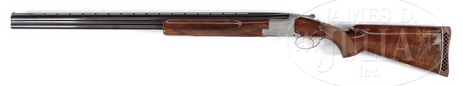 *BROWNING POINTER GRADE SUPERPOSED.SN 71855. Cal. 12 Ga. 30″ bbls. 3″ chambers. Choked: IMP MOD/IMP MOD. Full matted low profile ventilated rib with “certifiable pre-ban ivory” mid-bead and synthetic front sight. Gold plated single selective trigger, automatic ejectors, non-automatic safety. Stock configuration if FKLT with 14-9/16″ LOP over slightly compressed Browning white lined waffle pad. Trap forend. Receiver is beautifully engraved in game scene, signed by “L. Vrancken” on both sides of receiver. Left side with Setter and duck in marsh scene surrounded by scroll, right side with Pointer and pheasant in woods scene surrounded by scroll. Bottom of frame nicely scroll engraved with two birds surrounded by scroll. Trigger guard bow and forearm nicely scroll engraved. Buttstock finely checkered with 3-point checkering, as is forearm. Buttstock is a pretty piece of fiddle back walnut. Weight: 8 lb 2 oz. PROVENANCE: The Collection of Robert Burg. Special Note: This item contains or is made of ivory. Do not bid on this lot unless you have read and agreed to our "Ivory Position Statement" and the "Waiver of Legal and Financial Risk to James D. Julia in regards to your Purchase of an Ivory Object." This information is located in the front section of our catalog. CONDITION: Excellent. Bbl retains 95-98% of what appears to be factory orig blue, though could be an older rust blued restoration. Chambers having been lengthened. Buttstock and forend retain nearly all of their restored high gloss finish, checkering is sharp. Near invisible repair at left side of forearm at frame and minute stock separation behind frame on bottom of left side, which does not in any way detract from this gun. Mechanics are very good, ejectors may need slight adjustment. Bores bright and shiny. A beautiful Pointer Grade engraved by Vrancken. 49503-70 JSL92 IVORY (4,500-6,500) – Lot 1519