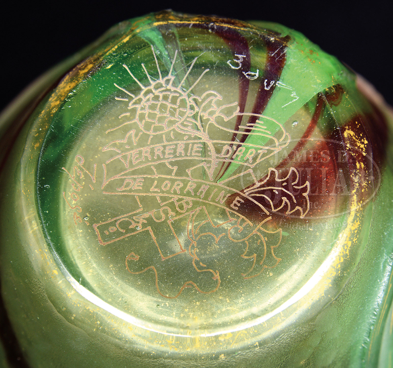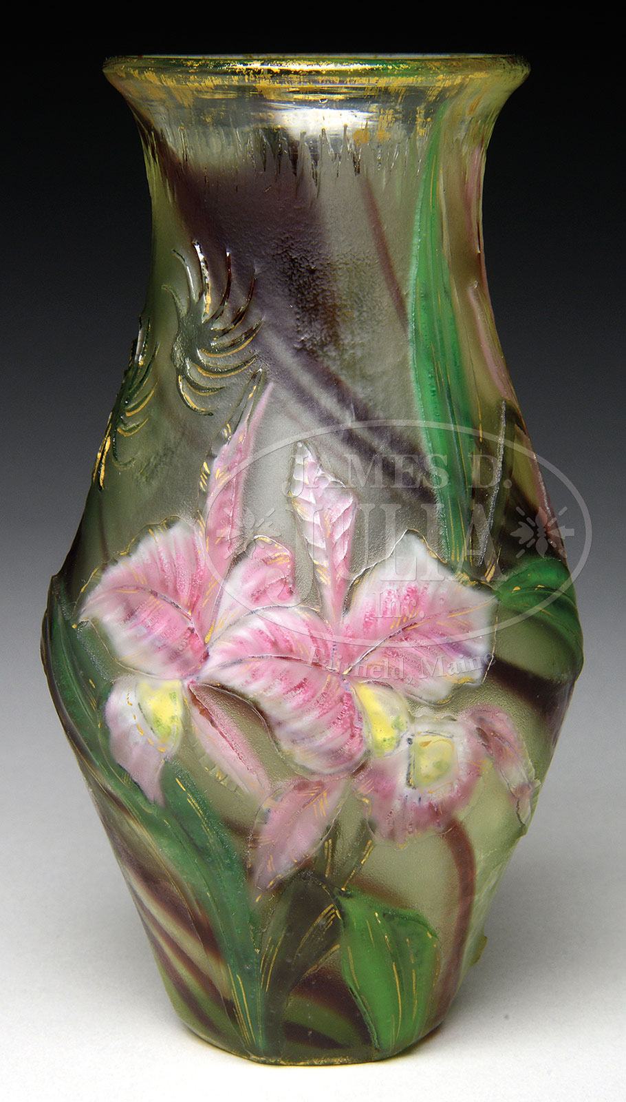 BURGUN & SCHVERER FLORAL CAMEO VASE.Burgun and Schverer ovoid vase with flared rim has wheel carved pink and white cameo flowers with yellow highlights with green cameo leaves, set against an interior decoration of swirling shades of maroon. Vase is further decorated with cameo pinwheels, random martele, icicle trim around the lip and gilded highlights. Signed on the underside with gilded thistle mark “Verririe D’Art de Lorraine BS & Co. Depose” and hand etched “3057”. SIZE: 6″ t. PROVENANCE: Rudd Collection, Chicago IL. CONDITION: Very good to excellent. 51894-2 (6,000-8,000) – Lot 1520