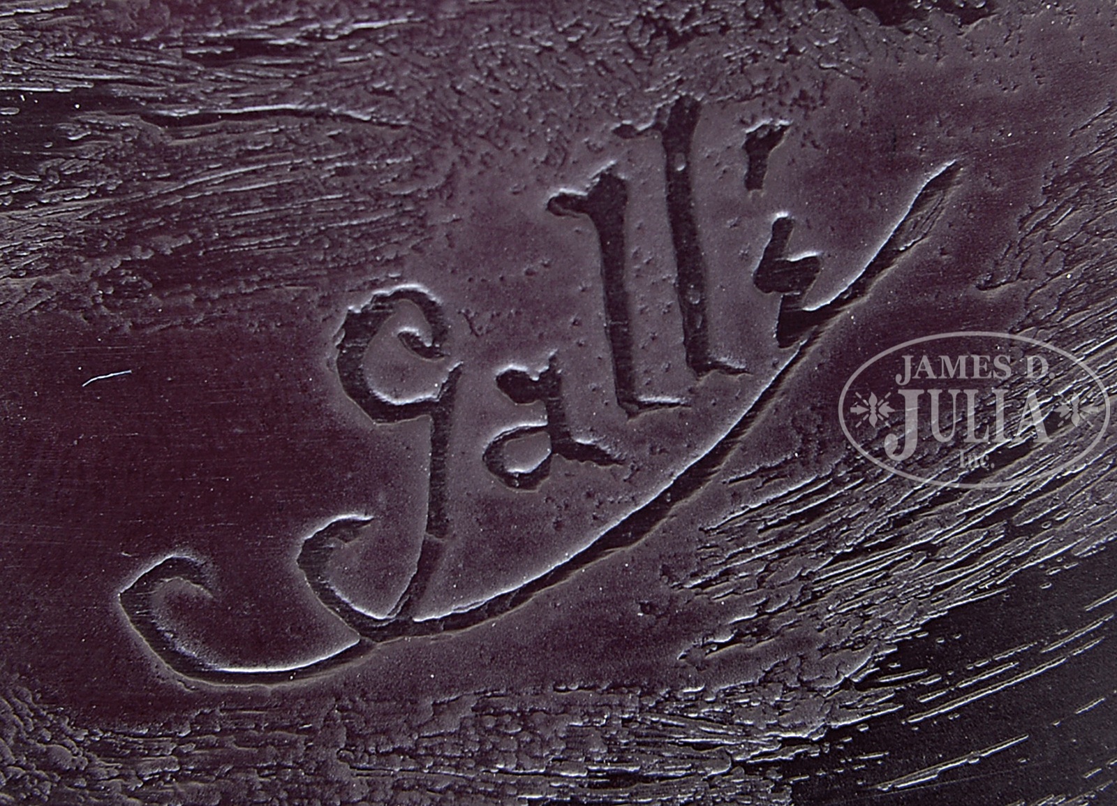 GALLE SCENIC CAMEO VASE.Galle vase has dark purple cameo decoration of a rocky hillside with tall pine trees and a cream colored pond framed by trees with a distant shore leading to tall light blue and yellow cameo mountains. Signed on side in cameo “Galle”. SIZE: 9-3/4″ t. CONDITION: Very good to excellent. 49774-24 (2,500-3,500) – Lot 1522