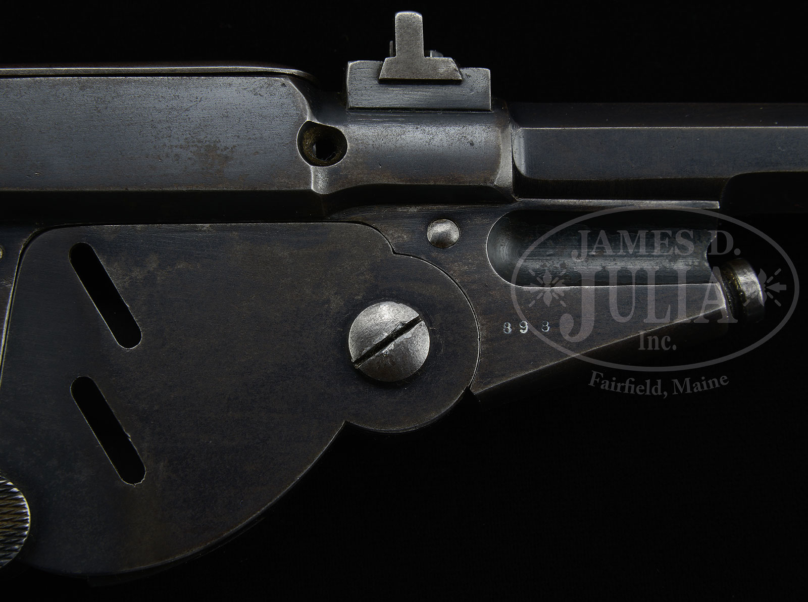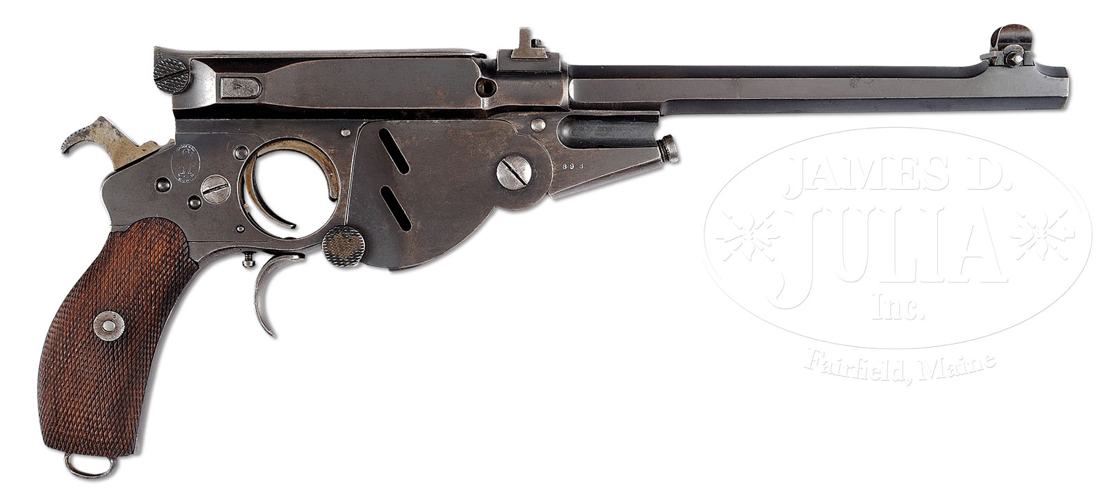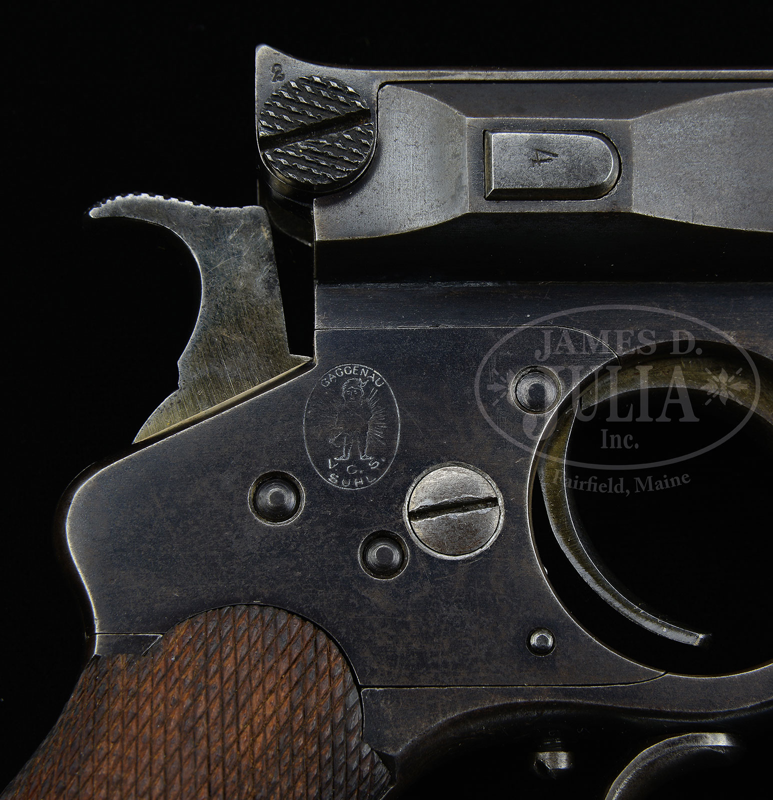 HIGHLY DESIRABLE BERGMANN M1896, NUMBER 3, TARGET PISTOL.SN 898. Cal. 6.5mm Bergmann. Theodor Bergmann was an early pioneer in the development of European semi-automatic pistols in the early 1890s and early 1900s. All of the Number 2s, 3s and 4s had an integral magazine that was loaded by rotating down the magazine sideplate and inserting a clip of cartridges from the side. Bergmann made very few target pistols, all in 6.5mm Bergmann. This gun has a longer than usual 7.25″ octagonal bbl, fully adjustable sights, a finger rest, a set trigger with its auxiliary cocking catch in the front of the trigger guard which must be pushed forward to cock the set trigger mechanism to fire the pistol, and a trigger stop. The screw-in bbl is marked 278 (bore gauge) on the left side. Adjacent to this number is the Crown/Crown/U proof marking that is repeated on the left side of the chamber. The left receiver, with long flutes, is marked “Patent Brevete S. G. D. G.” The SN 898 appears on the right side of the receiver just below the flute. In the center of the sideplate is the Bergmann factory logo featuring a miner surmounted by the word” “Gaggenau” and over V.C.S. Suhl. In this case, V.S.C were the initials for V. Charles Schilling, who made the pistols for Bergmann, with Suhl being the location. Walnut grips are finely checkered and without a logo. PROVENANCE: Dr. Geoffrey Sturgess Collection; The Esteemed Collection Of Noted Expert And Author Warren Buxton. CONDITION: The pistol is faded from use and mild oxidation with 80-85% blue mixed with patina, particularly over the sliding cover and front/back straps. Comparable fading and toning of the fire blue on the safety and the straw on the hammer, safety stop, and trigger. Nicely checkered, orig grips with comparable condition in-the-white grip screw and escutcheon. Bright bore with sharp rifling. A rare and distinctive Bergmann that should appeal to every collector of automatic pistols. 51568-18 LMA (12,500-15,500) – Lot 1522