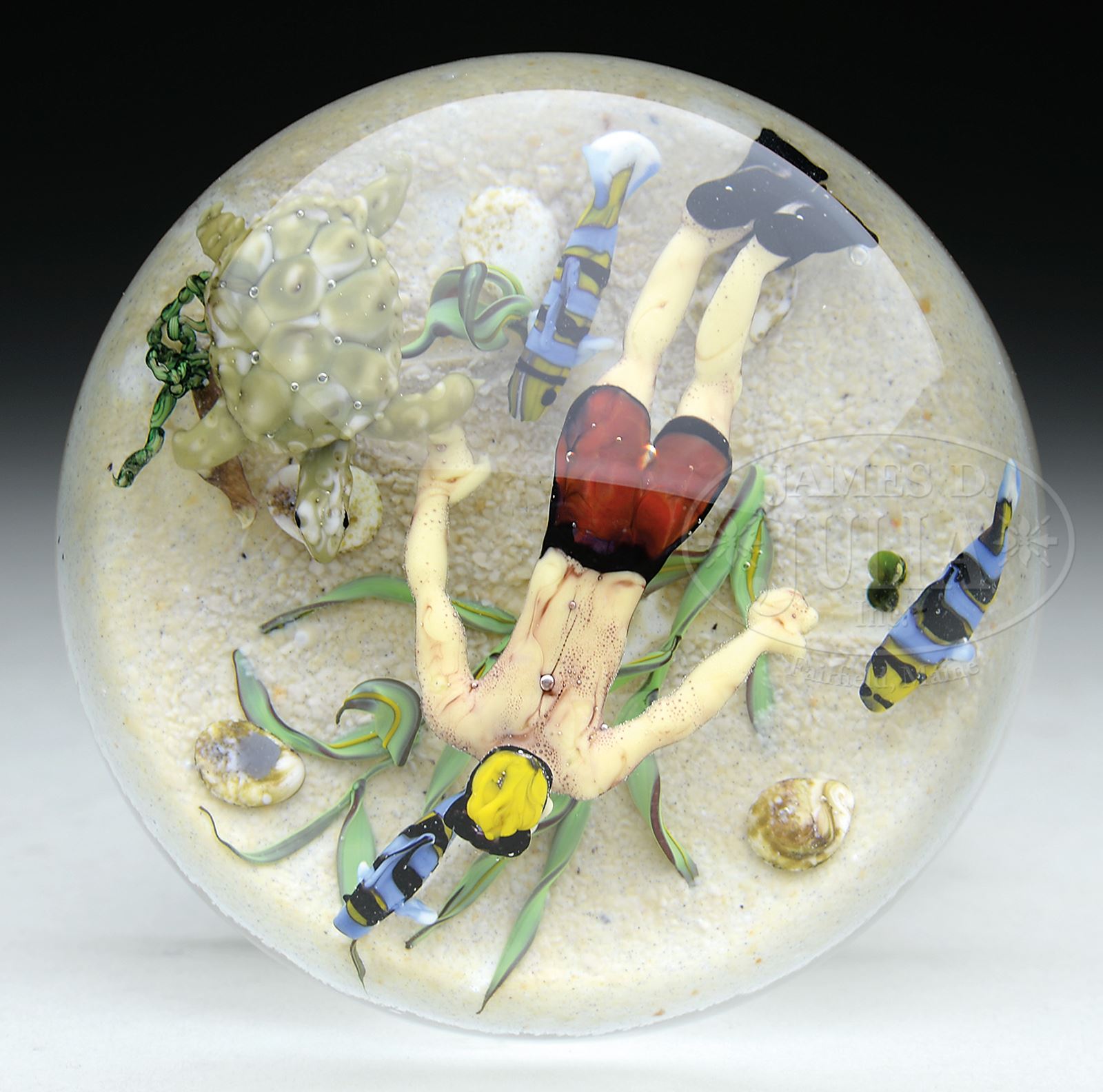 JIM D’ONOFRIO SNORKELER PAPERWEIGHT.A Jim D’Onofrio snorkeler paperweight features a sculpted flameworked snorkeler. The figure swims above three blue and black fish as well as along side a turtle. The design sits on a beige powdered ground with stones and sea grass. Paperweight is signed in script “Jim D’Onofrio 00 1154”. SIZE: 3-1/4″ x 2-3/4″ deep. CONDITION: Very good to excellent. 50397-29 (600-800) – Lot 1524
