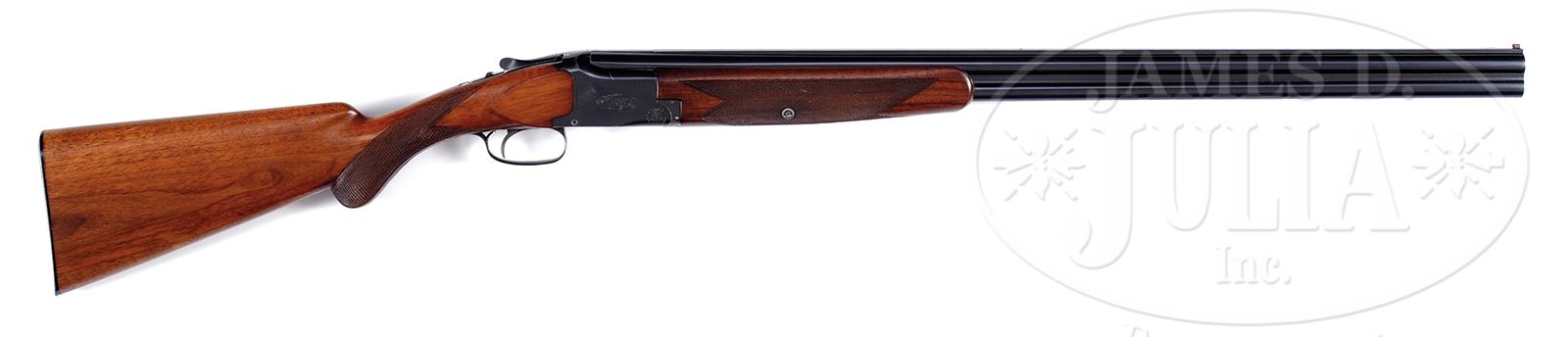 Please Note: Stock and forend have been refinished. *EARLY BROWNING SUPERPOSED GRADE 1 20 GAUGE.SN 911. 20 ga. 28″ bbls. 2-3/4″ chambers. CHOKED: Mod/Full. Full length matted raised top rib with “certifiable pre-ban ivory” mid bead and red plastic front bead. Single selective trigger, auto ejectors, non automatic safety. Stock is RKLT configuration checkered in 2-pt pattern with 13-5/8″ LOP over serrated lined HRBP. Forearm is checkered in 3-pt pattern. Receiver is lightly scroll and floral engraved in standard Grade 1 pattern. WEIGHT: 6 lbs 7 oz. Special Note: This item contains or is made of ivory. Do not bid on this lot unless you have read and agreed to our "Ivory Position Statement" and the "Waiver of Legal and Financial Risk to James D. Julia in regards to your Purchase of an Ivory Object." This information is located in the front section of our catalog. CONDITION: Very good. Bbls retain 90-95% factory blued finish. Receiver retains 85-90% orig blue with high point edge wear and losses on form iron at bottom. Trigger guard retains about half of its orig blue as does forearm metal. Buttstock and forearm retain most of their factory finish. Checkering is mostly sharp, though lightly worn at knob with light handling marks throughout. Mechanics are excellent. Bore is bright and shiny. 49527-12 JSL271 C&R; IVORY (2,000-3,000) – Lot 1525