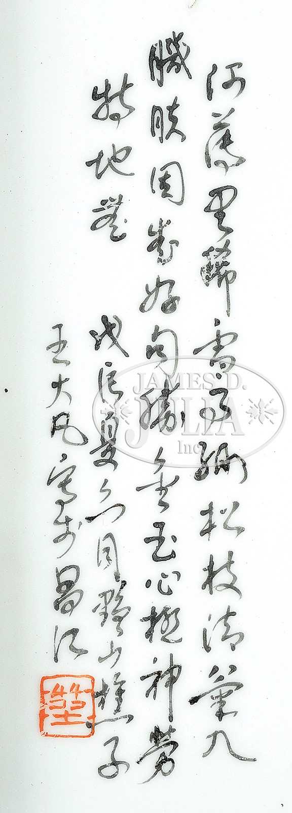 PORCELAIN PLAQUE WITH ENAMELED FIGURES.China, 20th century. The plaque hand painted with a scene depicting a scholar reciting his latest poem and a young servant seated on the ground with books. The inscription at left side showing a four-stanza seven-character poem with the main idea that eloquent lines are more precious than jade and gold. Comes with wood frame, bearing the name of Wang Da Fan. SIZE: Sight size 28-3/4″ x 8″. Overall 34-1/2″ x 12-3/4″. CONDITION: Very good. Frame with some scratching and scattered wear. 51327-1 (2,000-4,000) – Lot 1525