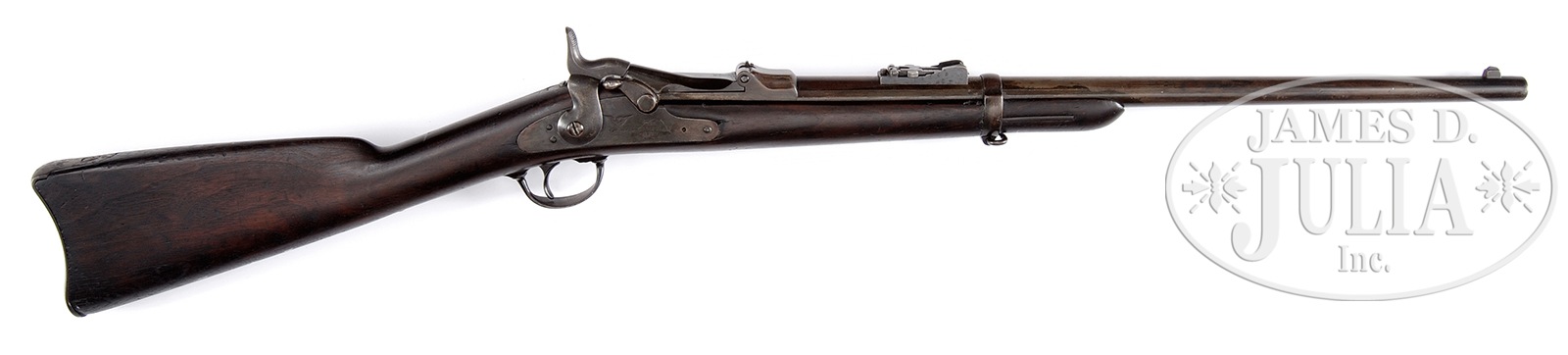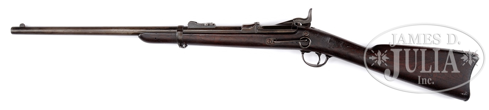 U.S. 1ST MODEL 1873 SPRINGFIELD ARMORY CARBINE FROM THE CUSTER SERIAL NO. RANGE.SN 32911. Cal. 45-70. 22″ Rnd bbl. Straight grain American walnut stock. Bbl shows no proof marks. Rear sight is attached by studs not screws and is of the carbine type. Receiver is flat-sided. Breechblock is marked “1873” over an eagle’s head with crossed arrows, over “U.S.”. Breechblock is of high arch type. Lock is marked “US” over “Springfield” over “1873” with a Springfield eagle clearly struck in front of hammer. The front bbl band retains the stacking swivel and an “U” inspector’s mark on right side. Saddle ring rod is unmarked on left side of stock. Buttplate is marked “US” on tang and has no provision for a trapdoor compartment. Stock is of thin wrist type lacking any provision in the butt for a cleaning rod. The left side of wrist is battered over the area where the cartouche would be present. There is the remnants of a circle “P” proof behind the trigger guard. CONDITION: Good to very good for an arm of this type. Bbl shows an even gray-brown patina with numerous dents and scratches overall. Sights are good. Bore is dark with some visible rifling. Receiver, breechblock, lockplate, hammer, trigger guard, barrelband and buttplate all show an even gray-brown patina overall. Stock is good. Left side at wrist has been quite heavily battered which obliterates any evidence of the inspector’s cartouche. This is an opportunity to obtain an orig unaltered 1st model 1873 Springfield carbine which is within the Custer serial no. range. 49767-9 TEP (3,000-4,000) – Lot 1526