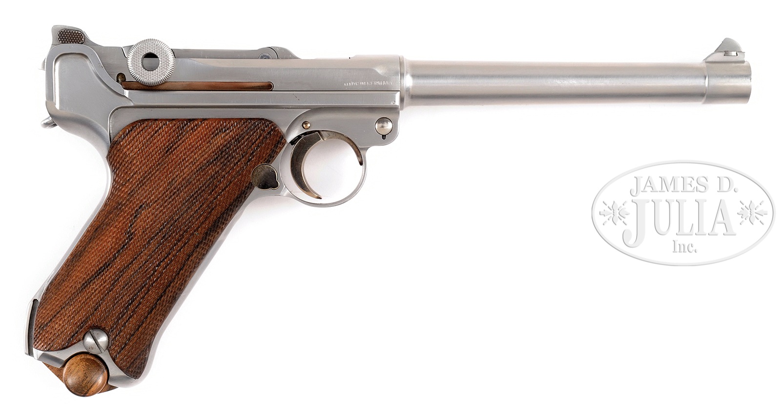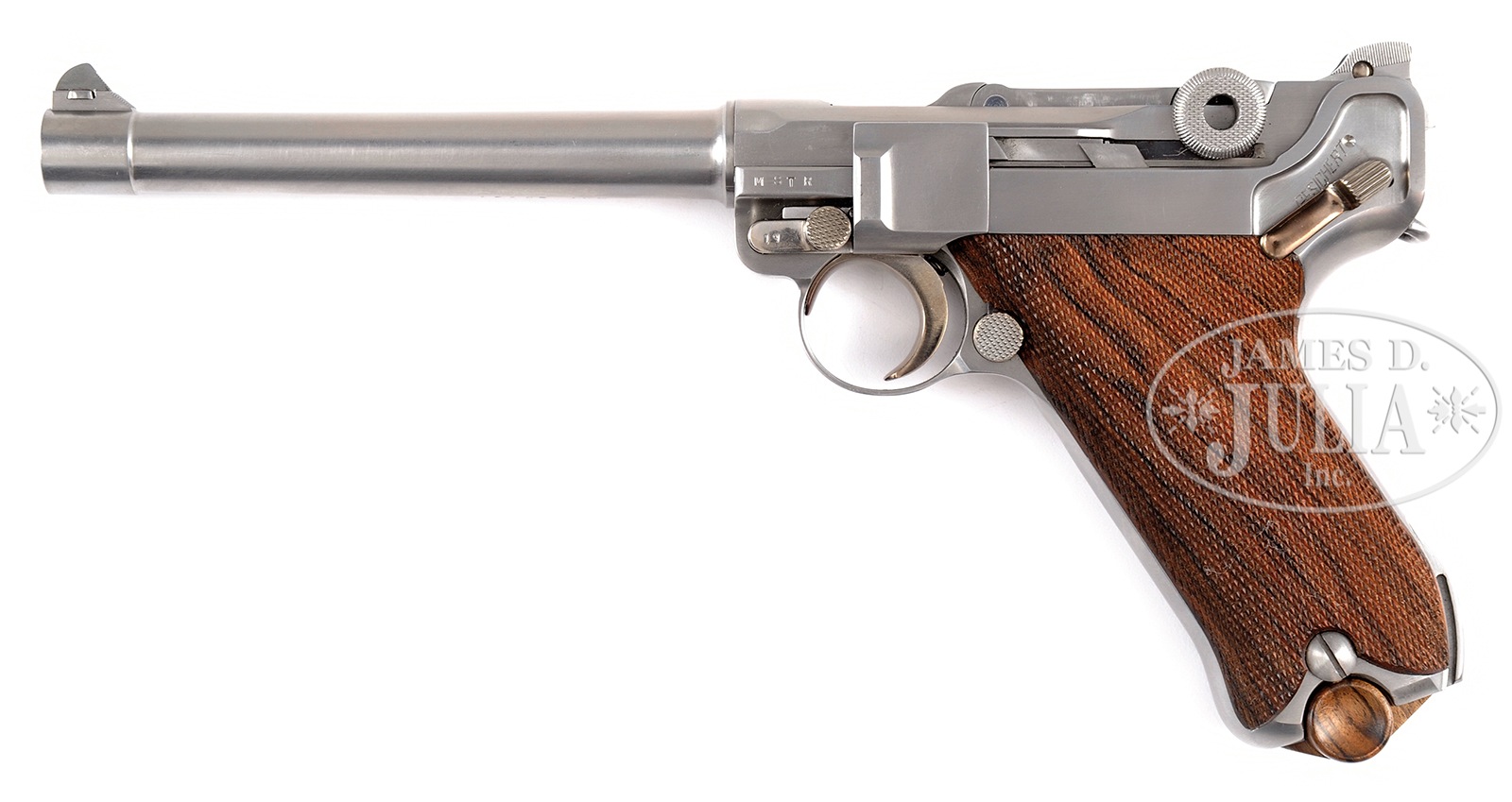 Please Note: The barrel length is 6″ not 8″. *SPECTACULAR JOHN MARTZ 45 ACP NAVY MODEL STAINLESS STEEL LUGER.SN 5919. Cal. 45 ACP. Masterfully made by John Martz. Bbl has 8″ stainless steel bbl with drift adjustable sight marked “45 ACP JVM” on bottom. Right side of frame is marked “Made in Germany”. Top of toggle with the Martz logo of “JVM” inside of a circle. Equipped with a slide adjustable Navy pattern rear sight adjustable to 200. Checkered grips made of highly figured dark walnut. Levers, trigger, and magazine release are straw finished. Balance of pistol is in a matte stainless steel polish. Estimated to be 25 or less of these Navy models produced. All internal parts numbered to match. Comes complete with spare magazine and factory paperwork. CONDITION: Overall no evidence of use other than possible test fire. No amount of distress has been found. A masterfully manufactured interpretation of the famed Navy Luger. 51034-1 TDW (3,500-6,500) – Lot 1527 Click here to view provenance